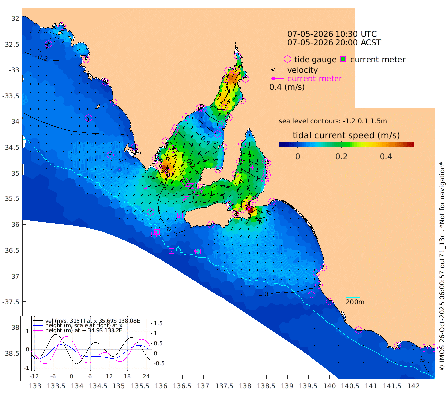 1cm/s -108T +10cm/s rms + 5cm/s 114T. SAM1DS 520m 10cm/s -120T +13cm/s rms + 5cm/s -36T. SAM2CP 100m 9cm/s -101T +21cm/s rms + 18cm/s 142T. SAM3MS 168m 10cm/s -78T +22cm/s rms + 0cm/s -30T. SAM4CY 117m 3cm/s -155T +23cm/s rms + 2cm/s 99T. SAM5CB 94m 13cm/s -119T +8cm/s rms + 3cm/s -172T. SAM6IS 83m 3cm/s -104T +11cm/s rms + 7cm/s 150T. SAM7DS 519m 15cm/s -98T +10cm/s rms + 2cm/s 87T. SAM8SG 47m 8cm/s -153T +20cm/s rms + 12cm/s -168T. NRSKAI 101m 4cm Warrnambool 6cm Port Fairy 5cm Portland 9cm Port Macdonnell 4cm Beachport 5cm Cape Rabelais (off) 3cm Robe 7cm Cape Jaffa 6cm Kingston 8cm Victor Harbor -2cm Vivonne Bay 52cm Kingscote 52cm American River 39cm Penneshaw 46cm Cape Jervis 66cm Second Valley 77cm Port Noarlunga 79cm Port Stanvac 81cm Brighton 82cm Glenelg 91cm Port Adelaide (Outer Harbor) 103cm Angus Inlet (Garden Island) 104cm Ardrossan 90cm Port Vincent 70cm Port Giles 14cm Stenhouse Bay 19cm Althorpe Island 15cm Pondalowie Bay 34cm Point Turton 36cm Port Victoria 47cm Cape Elizabeth 51cm Tiparra Reef Light 70cm Wallaroo 77cm Middle Bank 54cm Port Broughton 113cm Port Pirie 126cm Red Cliff Point (Beacon 5) 116cm Port Bonython 116cm Whyalla 105cm Western Shoal Beacon 70cm Franklin Harbor 52cm Franklin Harbor Entrance Beacon 38cm Arno Bay 35cm Port Neill 29cm Cape Hardy 22cm Tumby Bay 21cm Reevesby Island 10cm Port Lincoln 4cm Taylors Landing 25cm Whalers Bay 13cm Wedge Island Mooring 4cm Shelf Edge Mooring 0cm Coffin Bay Entrance Beacon -2cm Greenly Island -5cm Elliston -4cm Pearson Island 3cm Venus Bay -12cm Blanche Port (Streaky Bay) -16cm Thevenard -12cm St Francis Island
