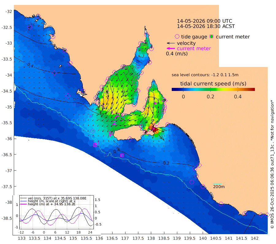 1cm/s -99T +10cm/s rms + 5cm/s 114T. SAM1DS 520m 7cm/s -135T +13cm/s rms + 5cm/s -36T. SAM2CP 100m 7cm/s -132T +21cm/s rms + 18cm/s 142T. SAM3MS 168m 3cm/s -81T +22cm/s rms + 0cm/s -30T. SAM4CY 117m 2cm/s 133T +23cm/s rms + 2cm/s 99T. SAM5CB 94m 15cm/s -130T +8cm/s rms + 3cm/s -172T. SAM6IS 83m 3cm/s -132T +11cm/s rms + 7cm/s 150T. SAM7DS 519m 23cm/s -149T +10cm/s rms + 2cm/s 87T. SAM8SG 47m 17cm/s -164T +20cm/s rms + 12cm/s -168T. NRSKAI 101m -8cm Warrnambool -9cm Port Fairy -12cm Portland -13cm Port Macdonnell -16cm Beachport -17cm Cape Rabelais (off) -17cm Robe -16cm Cape Jaffa -16cm Kingston -20cm Victor Harbor -22cm Vivonne Bay -8cm Kingscote -5cm American River -15cm Penneshaw -5cm Cape Jervis 8cm Second Valley 3cm Port Noarlunga 2cm Port Stanvac 4cm Brighton 2cm Glenelg 8cm Port Adelaide (Outer Harbor) 31cm Angus Inlet (Garden Island) 5cm Ardrossan -17cm Port Vincent -10cm Port Giles -26cm Stenhouse Bay -21cm Althorpe Island -22cm Pondalowie Bay -18cm Point Turton -20cm Port Victoria -11cm Cape Elizabeth -2cm Tiparra Reef Light 22cm Wallaroo 26cm Middle Bank 43cm Port Broughton 101cm Port Pirie 121cm Red Cliff Point (Beacon 5) 83cm Port Bonython 86cm Whyalla 75cm Western Shoal Beacon 20cm Franklin Harbor -12cm Franklin Harbor Entrance Beacon -28cm Arno Bay -36cm Port Neill -35cm Cape Hardy -38cm Tumby Bay -38cm Reevesby Island -42cm Port Lincoln -38cm Taylors Landing -25cm Whalers Bay -28cm Wedge Island Mooring -22cm Shelf Edge Mooring -34cm Coffin Bay Entrance Beacon -29cm Greenly Island -36cm Elliston -39cm Pearson Island -28cm Venus Bay -57cm Blanche Port (Streaky Bay) -57cm Thevenard -48cm St Francis Island