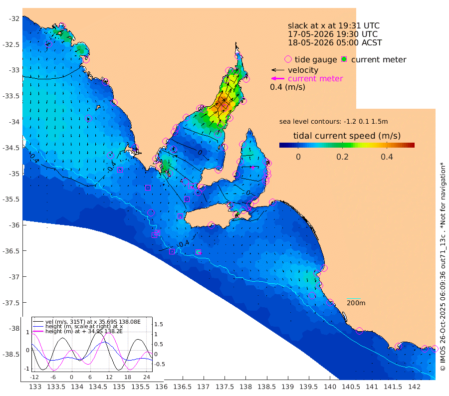 1cm/s 99T +10cm/s rms + 5cm/s 114T. SAM1DS 520m 1cm/s 179T +13cm/s rms + 5cm/s -36T. SAM2CP 100m 5cm/s 48T +21cm/s rms + 18cm/s 142T. SAM3MS 168m 11cm/s 108T +22cm/s rms + 0cm/s -30T. SAM4CY 117m 4cm/s 171T +23cm/s rms + 2cm/s 99T. SAM5CB 94m 1cm/s 99T +8cm/s rms + 3cm/s -172T. SAM6IS 83m 2cm/s 45T +11cm/s rms + 7cm/s 150T. SAM7DS 519m 6cm/s 135T +10cm/s rms + 2cm/s 87T. SAM8SG 47m 4cm/s -176T +20cm/s rms + 12cm/s -168T. NRSKAI 101m -53cm Warrnambool -50cm Port Fairy -50cm Portland -48cm Port Macdonnell -45cm Beachport -48cm Cape Rabelais (off) -48cm Robe -50cm Cape Jaffa -49cm Kingston -44cm Victor Harbor -41cm Vivonne Bay 4cm Kingscote -3cm American River -7cm Penneshaw -1cm Cape Jervis 11cm Second Valley 30cm Port Noarlunga 33cm Port Stanvac 36cm Brighton 40cm Glenelg 46cm Port Adelaide (Outer Harbor) 39cm Angus Inlet (Garden Island) 67cm Ardrossan 48cm Port Vincent 34cm Port Giles -24cm Stenhouse Bay -32cm Althorpe Island -30cm Pondalowie Bay -25cm Point Turton -18cm Port Victoria -20cm Cape Elizabeth -30cm Tiparra Reef Light -38cm Wallaroo -34cm Middle Bank -61cm Port Broughton -84cm Port Pirie -77cm Red Cliff Point (Beacon 5) -64cm Port Bonython -62cm Whyalla -58cm Western Shoal Beacon -19cm Franklin Harbor -14cm Franklin Harbor Entrance Beacon -14cm Arno Bay -17cm Port Neill -21cm Cape Hardy -23cm Tumby Bay -26cm Reevesby Island -28cm Port Lincoln -33cm Taylors Landing -23cm Whalers Bay -33cm Wedge Island Mooring -43cm Shelf Edge Mooring -46cm Coffin Bay Entrance Beacon -41cm Greenly Island -46cm Elliston -44cm Pearson Island -38cm Venus Bay -55cm Blanche Port (Streaky Bay) -53cm Thevenard -56cm St Francis Island