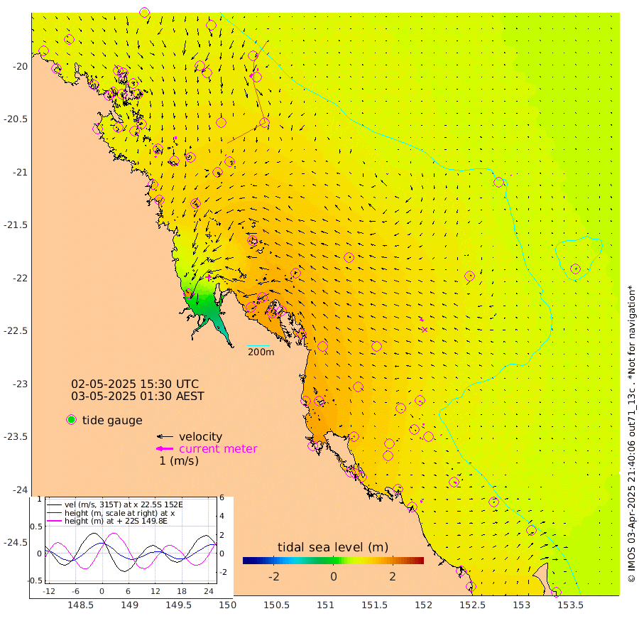 12cm/s -129T +10cm/s rms + 2cm/s 5T. Brampton I 18m 16cm/s 175T +9cm/s rms + 6cm/s 66T. Wigton I 38m 5cm/s -53T +7cm/s rms + 8cm/s 141T. Tern I 47m 13cm/s 174T +7cm/s rms + 12cm/s 54T. N Bugatti Rf 64m 22cm/s -151T +3cm/s rms + 13cm/s 178T. W Bugatti Rf 70m 5cm/s -175T +3cm/s rms + 3cm/s -130T. Creal Rf 69m 9cm/s 178T +7cm/s rms + 4cm/s 2T. North Rf 62m 9cm/s 13T +9cm/s rms + 2cm/s -56T. Cape Capricorn 26m 16cm/s 118T +5cm/s rms + 3cm/s 166T. L Musgrave I 42m 12cm/s 119T +9cm/s rms + 1cm/s -142T. Round Hill Hd 26m 3cm/s -38T +41cm/s rms + 48cm/s 116T. GBRELR 305m 20cm/s -65T +7cm/s rms + 6cm/s 123T. GBRCCH 92m 9cm/s 125T +8cm/s rms + 3cm/s -33T. GBRHIN 45m 8cm/s 100T +4cm/s rms + 2cm/s 41T. GBRHIS 46m 4cm/s 125T +16cm/s rms + 4cm/s -22T. GBROTE 59m 128cm Bell Cay 98cm Holbourne I 139cm Tern I 97cm Bugatti Rf 110cm Creal Rf 89cm White Tip I 105cm North Rf 126cm Rundle I 80cm L Musgrave I 59cm Saumarez Reef 88cm Kennedy Reef 90cm Unnamed Reef No. 2 88cm Abbot Point 92cm Bowen 98cm Tideway Reef 98cm Hayman Island 112cm Square Reef 118cm Double Bay 117cm Molle Island 96cm Cid Harbour 109cm Hook Island 94cm Border Island 96cm Haslewood Island 105cm Shute Harbour 112cm Thomas Island 125cm Credlin Reef 121cm East Repulse Island 109cm Blacksmith Island 120cm Laguna Quays 130cm Carlisle Island (Off) 132cm St. Bees Island 117cm Scawfell Island 140cm Penrith Island 144cm Mackay Outer Harbour 153cm Hay Point 158cm Prudhoe Island 181cm Middle Island (Percy Isles) 125cm Gannet Cay 73cm Elusive Reef 184cm Mcewin Islet 173cm Mumford Island 174cm Osborn Island 185cm Marquis Island 165cm Reef Point 149cm High Peak Island 167cm Port Clinton 148cm Peaked Island 105cm Karamea Bank 139cm Johnson Patch - NW 152cm Rosslyn Bay 150cm Middle Island (Keppel Isles) 167cm Port Alma 104cm Heron Island 112cm One Tree Islet 112cm Polmaise Reef 111cm Tryon Island 114cm Rock Cod Shoal 123cm Gatcombe Head 139cm Gladstone 132cm South Trees (Storm Surge) 100cm Clews Point 95cm Round Hill Head 77cm Lady Elliot Island 78cm Breaksea Spit 98cm Bundaberg (Burnett Heads) 96cm Elliot Heads 63cm Waddy Point (Fraser Island)