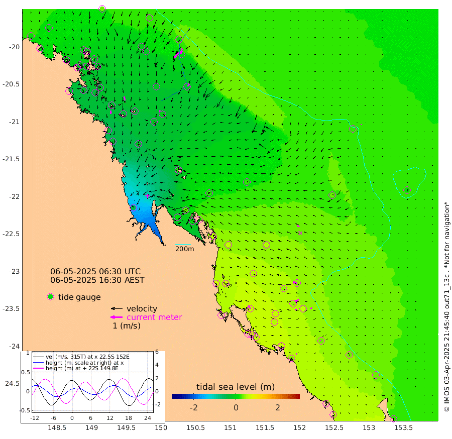 28cm/s 177T +10cm/s rms + 2cm/s 5T. Brampton I 18m 33cm/s 170T +9cm/s rms + 6cm/s 66T. Wigton I 38m 14cm/s -155T +7cm/s rms + 8cm/s 141T. Tern I 47m 50cm/s -165T +7cm/s rms + 12cm/s 54T. N Bugatti Rf 64m 59cm/s -148T +3cm/s rms + 13cm/s 178T. W Bugatti Rf 70m 20cm/s -163T +3cm/s rms + 3cm/s -130T. Creal Rf 69m 31cm/s -75T +7cm/s rms + 4cm/s 2T. North Rf 62m 33cm/s -28T +9cm/s rms + 2cm/s -56T. Cape Capricorn 26m 6cm/s -86T +5cm/s rms + 3cm/s 166T. L Musgrave I 42m 10cm/s -62T +9cm/s rms + 1cm/s -142T. Round Hill Hd 26m 4cm/s -129T +41cm/s rms + 48cm/s 116T. GBRELR 305m 22cm/s -67T +7cm/s rms + 6cm/s 123T. GBRCCH 92m 33cm/s -114T +8cm/s rms + 3cm/s -33T. GBRHIN 45m 15cm/s -94T +4cm/s rms + 2cm/s 41T. GBRHIS 46m 14cm/s -145T +16cm/s rms + 4cm/s -22T. GBROTE 59m 24cm Bell Cay 14cm Holbourne I -5cm Tern I 2cm Bugatti Rf -5cm Creal Rf 10cm White Tip I 45cm North Rf 65cm Rundle I 36cm L Musgrave I 13cm Saumarez Reef 29cm Kennedy Reef 22cm Unnamed Reef No. 2 10cm Abbot Point 5cm Bowen -7cm Tideway Reef 9cm Hayman Island -18cm Square Reef 8cm Double Bay -14cm Molle Island -14cm Cid Harbour 3cm Hook Island -15cm Border Island -22cm Haslewood Island -9cm Shute Harbour -20cm Thomas Island -13cm Credlin Reef -24cm East Repulse Island -29cm Blacksmith Island -34cm Laguna Quays -22cm Carlisle Island (Off) -29cm St. Bees Island -30cm Scawfell Island -11cm Penrith Island -25cm Mackay Outer Harbour -21cm Hay Point -13cm Prudhoe Island 21cm Middle Island (Percy Isles) 30cm Gannet Cay 22cm Elusive Reef -46cm Mcewin Islet 35cm Mumford Island 17cm Osborn Island 12cm Marquis Island 17cm Reef Point 24cm High Peak Island 58cm Port Clinton 59cm Peaked Island 50cm Karamea Bank 56cm Johnson Patch - NW 67cm Rosslyn Bay 68cm Middle Island (Keppel Isles) 70cm Port Alma 44cm Heron Island 57cm One Tree Islet 58cm Polmaise Reef 45cm Tryon Island 55cm Rock Cod Shoal 58cm Gatcombe Head 62cm Gladstone 64cm South Trees (Storm Surge) 60cm Clews Point 46cm Round Hill Head 32cm Lady Elliot Island 35cm Breaksea Spit 51cm Bundaberg (Burnett Heads) 48cm Elliot Heads 21cm Waddy Point (Fraser Island)
