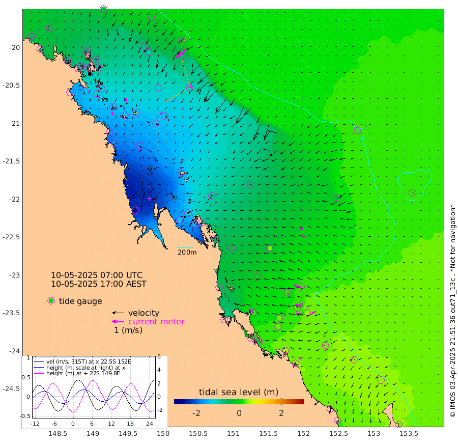31cm/s 173T +10cm/s rms + 2cm/s 5T. Brampton I 18m 32cm/s 178T +9cm/s rms + 6cm/s 66T. Wigton I 38m 25cm/s -147T +7cm/s rms + 8cm/s 141T. Tern I 47m 49cm/s -157T +7cm/s rms + 12cm/s 54T. N Bugatti Rf 64m 56cm/s -141T +3cm/s rms + 13cm/s 178T. W Bugatti Rf 70m 26cm/s -152T +3cm/s rms + 3cm/s -130T. Creal Rf 69m 59cm/s -76T +7cm/s rms + 4cm/s 2T. North Rf 62m 48cm/s -38T +9cm/s rms + 2cm/s -56T. Cape Capricorn 26m 18cm/s -94T +5cm/s rms + 3cm/s 166T. L Musgrave I 42m 21cm/s -72T +9cm/s rms + 1cm/s -142T. Round Hill Hd 26m 7cm/s -108T +41cm/s rms + 48cm/s 116T. GBRELR 305m 31cm/s -67T +7cm/s rms + 6cm/s 123T. GBRCCH 92m 66cm/s -101T +8cm/s rms + 3cm/s -33T. GBRHIN 45m 40cm/s -92T +4cm/s rms + 2cm/s 41T. GBRHIS 46m 35cm/s -111T +16cm/s rms + 4cm/s -22T. GBROTE 59m -55cm Bell Cay -45cm Holbourne I -126cm Tern I -50cm Bugatti Rf -84cm Creal Rf -25cm White Tip I 25cm North Rf 27cm Rundle I 37cm L Musgrave I 20cm Saumarez Reef -19cm Kennedy Reef -10cm Unnamed Reef No. 2 -39cm Abbot Point -50cm Bowen -76cm Tideway Reef -51cm Hayman Island -98cm Square Reef -73cm Double Bay -90cm Molle Island -81cm Cid Harbour -71cm Hook Island -79cm Border Island -91cm Haslewood Island -88cm Shute Harbour -119cm Thomas Island -108cm Credlin Reef -129cm East Repulse Island -120cm Blacksmith Island -147cm Laguna Quays -128cm Carlisle Island (Off) -136cm St. Bees Island -118cm Scawfell Island -123cm Penrith Island -160cm Mackay Outer Harbour -167cm Hay Point -168cm Prudhoe Island -131cm Middle Island (Percy Isles) -44cm Gannet Cay 20cm Elusive Reef -248cm Mcewin Islet -98cm Mumford Island -123cm Osborn Island -131cm Marquis Island -114cm Reef Point -81cm High Peak Island -45cm Port Clinton -22cm Peaked Island 30cm Karamea Bank 5cm Johnson Patch - NW -1cm Rosslyn Bay 2cm Middle Island (Keppel Isles) -16cm Port Alma 30cm Heron Island 43cm One Tree Islet 34cm Polmaise Reef 24cm Tryon Island 33cm Rock Cod Shoal 17cm Gatcombe Head 6cm Gladstone 18cm South Trees (Storm Surge) 48cm Clews Point 39cm Round Hill Head 39cm Lady Elliot Island 45cm Breaksea Spit 38cm Bundaberg (Burnett Heads) 42cm Elliot Heads 36cm Waddy Point (Fraser Island)