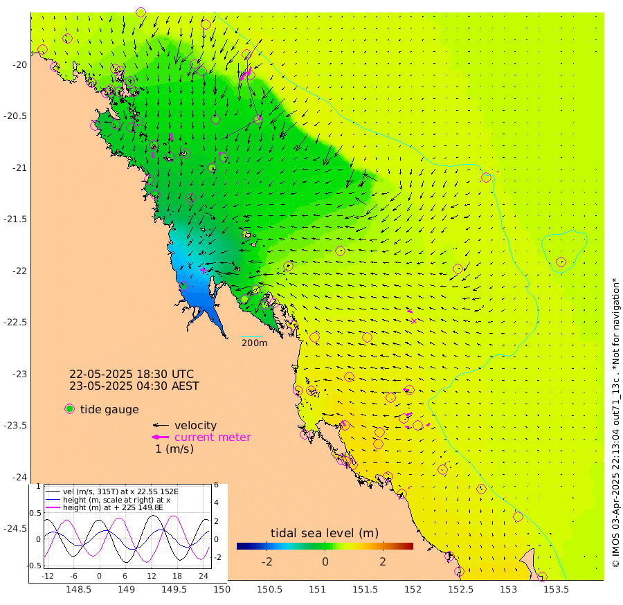 36cm/s 173T +10cm/s rms + 2cm/s 5T. Brampton I 18m 43cm/s 173T +9cm/s rms + 6cm/s 66T. Wigton I 38m 19cm/s -155T +7cm/s rms + 8cm/s 141T. Tern I 47m 56cm/s -162T +7cm/s rms + 12cm/s 54T. N Bugatti Rf 64m 64cm/s -149T +3cm/s rms + 13cm/s 178T. W Bugatti Rf 70m 28cm/s -166T +3cm/s rms + 3cm/s -130T. Creal Rf 69m 36cm/s -84T +7cm/s rms + 4cm/s 2T. North Rf 62m 36cm/s -32T +9cm/s rms + 2cm/s -56T. Cape Capricorn 26m 6cm/s -130T +5cm/s rms + 3cm/s 166T. L Musgrave I 42m 6cm/s -77T +9cm/s rms + 1cm/s -142T. Round Hill Hd 26m 4cm/s -136T +41cm/s rms + 48cm/s 116T. GBRELR 305m 32cm/s -72T +7cm/s rms + 6cm/s 123T. GBRCCH 92m 38cm/s -111T +8cm/s rms + 3cm/s -33T. GBRHIN 45m 21cm/s -98T +4cm/s rms + 2cm/s 41T. GBRHIS 46m 23cm/s -130T +16cm/s rms + 4cm/s -22T. GBROTE 59m 62cm Bell Cay 54cm Holbourne I 24cm Tern I 44cm Bugatti Rf 30cm Creal Rf 56cm White Tip I 93cm North Rf 117cm Rundle I 78cm L Musgrave I 61cm Saumarez Reef 60cm Kennedy Reef 70cm Unnamed Reef No. 2 58cm Abbot Point 52cm Bowen 32cm Tideway Reef 50cm Hayman Island 27cm Square Reef 53cm Double Bay 46cm Molle Island 29cm Cid Harbour 42cm Hook Island 23cm Border Island 25cm Haslewood Island 30cm Shute Harbour 9cm Thomas Island 27cm Credlin Reef 15cm East Repulse Island 3cm Blacksmith Island -5cm Laguna Quays 23cm Carlisle Island (Off) 5cm St. Bees Island 8cm Scawfell Island 30cm Penrith Island 1cm Mackay Outer Harbour 3cm Hay Point 6cm Prudhoe Island 47cm Middle Island (Percy Isles) 66cm Gannet Cay 65cm Elusive Reef -56cm Mcewin Islet 63cm Mumford Island 45cm Osborn Island 47cm Marquis Island 51cm Reef Point 64cm High Peak Island 99cm Port Clinton 102cm Peaked Island 102cm Karamea Bank 105cm Johnson Patch - NW 119cm Rosslyn Bay 123cm Middle Island (Keppel Isles) 124cm Port Alma 98cm Heron Island 103cm One Tree Islet 103cm Polmaise Reef 94cm Tryon Island 114cm Rock Cod Shoal 109cm Gatcombe Head 113cm Gladstone 116cm South Trees (Storm Surge) 103cm Clews Point 93cm Round Hill Head 77cm Lady Elliot Island 73cm Breaksea Spit 99cm Bundaberg (Burnett Heads) 103cm Elliot Heads 57cm Waddy Point (Fraser Island)