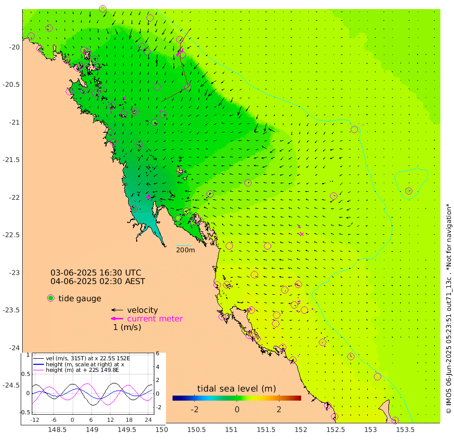 20cm/s 178T +10cm/s rms + 2cm/s 5T. Brampton I 18m 25cm/s 177T +9cm/s rms + 6cm/s 66T. Wigton I 38m 12cm/s -145T +7cm/s rms + 8cm/s 141T. Tern I 47m 33cm/s -158T +7cm/s rms + 12cm/s 54T. N Bugatti Rf 64m 35cm/s -144T +3cm/s rms + 13cm/s 178T. W Bugatti Rf 70m 15cm/s -156T +3cm/s rms + 3cm/s -130T. Creal Rf 69m 25cm/s -88T +7cm/s rms + 4cm/s 2T. North Rf 62m 23cm/s -33T +9cm/s rms + 2cm/s -56T. Cape Capricorn 26m 4cm/s 171T +5cm/s rms + 3cm/s 166T. L Musgrave I 42m 4cm/s -108T +9cm/s rms + 1cm/s -142T. Round Hill Hd 26m 3cm/s -87T +41cm/s rms + 48cm/s 116T. GBRELR 305m 20cm/s -69T +7cm/s rms + 6cm/s 123T. GBRCCH 92m 22cm/s -111T +8cm/s rms + 3cm/s -33T. GBRHIN 45m 12cm/s -95T +4cm/s rms + 2cm/s 41T. GBRHIS 46m 12cm/s -113T +16cm/s rms + 4cm/s -22T. GBROTE 59m 44cm Bell Cay 37cm Holbourne I 17cm Tern I 33cm Bugatti Rf 24cm Creal Rf 41cm White Tip I 69cm North Rf 81cm Rundle I 60cm L Musgrave I 43cm Saumarez Reef 43cm Kennedy Reef 45cm Unnamed Reef No. 2 31cm Abbot Point 28cm Bowen 19cm Tideway Reef 31cm Hayman Island 21cm Square Reef 34cm Double Bay 35cm Molle Island 14cm Cid Harbour 27cm Hook Island 14cm Border Island 10cm Haslewood Island 17cm Shute Harbour 5cm Thomas Island 12cm Credlin Reef -6cm East Repulse Island 3cm Blacksmith Island -4cm Laguna Quays 4cm Carlisle Island (Off) -7cm St. Bees Island 3cm Scawfell Island 23cm Penrith Island 2cm Mackay Outer Harbour 4cm Hay Point 9cm Prudhoe Island 50cm Middle Island (Percy Isles) 51cm Gannet Cay 49cm Elusive Reef -20cm Mcewin Islet 53cm Mumford Island 33cm Osborn Island 29cm Marquis Island 31cm Reef Point 45cm High Peak Island 73cm Port Clinton 68cm Peaked Island 68cm Karamea Bank 86cm Johnson Patch - NW 82cm Rosslyn Bay 80cm Middle Island (Keppel Isles) 86cm Port Alma 73cm Heron Island 84cm One Tree Islet 80cm Polmaise Reef 71cm Tryon Island 73cm Rock Cod Shoal 79cm Gatcombe Head 81cm Gladstone 82cm South Trees (Storm Surge) 78cm Clews Point 70cm Round Hill Head 59cm Lady Elliot Island 62cm Breaksea Spit 74cm Bundaberg (Burnett Heads) 76cm Elliot Heads 49cm Waddy Point (Fraser Island)