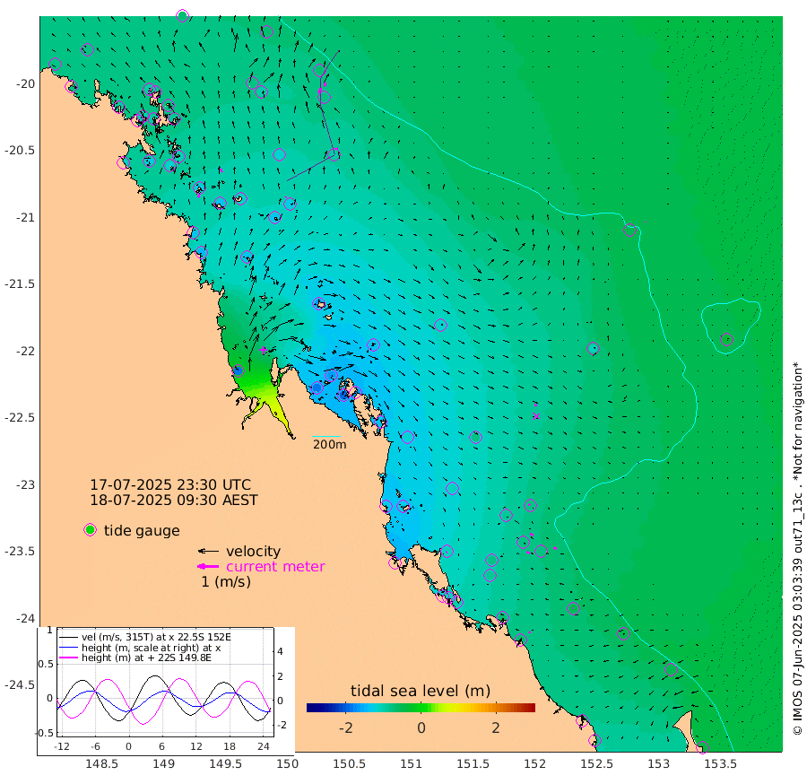 11cm/s 45T +10cm/s rms + 2cm/s 5T. Brampton I 18m 15cm/s -14T +9cm/s rms + 6cm/s 66T. Wigton I 38m 4cm/s -171T +7cm/s rms + 8cm/s 141T. Tern I 47m 16cm/s -6T +7cm/s rms + 12cm/s 54T. N Bugatti Rf 64m 25cm/s 26T +3cm/s rms + 13cm/s 178T. W Bugatti Rf 70m 9cm/s -18T +3cm/s rms + 3cm/s -130T. Creal Rf 69m 8cm/s -46T +7cm/s rms + 4cm/s 2T. North Rf 62m 5cm/s -128T +9cm/s rms + 2cm/s -56T. Cape Capricorn 26m 4cm/s -77T +5cm/s rms + 3cm/s 166T. L Musgrave I 42m 9cm/s -70T +9cm/s rms + 1cm/s -142T. Round Hill Hd 26m 2cm/s 159T +41cm/s rms + 48cm/s 116T. GBRELR 305m 11cm/s 109T +7cm/s rms + 6cm/s 123T. GBRCCH 92m 16cm/s -73T +8cm/s rms + 3cm/s -33T. GBRHIN 45m 13cm/s -83T +4cm/s rms + 2cm/s 41T. GBRHIS 46m 15cm/s -69T +16cm/s rms + 4cm/s -22T. GBROTE 59m -114cm Bell Cay -80cm Holbourne I -130cm Tern I -82cm Bugatti Rf -98cm Creal Rf -71cm White Tip I -82cm North Rf -104cm Rundle I -56cm L Musgrave I -31cm Saumarez Reef -75cm Kennedy Reef -70cm Unnamed Reef No. 2 -77cm Abbot Point -81cm Bowen -84cm Tideway Reef -95cm Hayman Island -96cm Square Reef -99cm Double Bay -107cm Molle Island -97cm Cid Harbour -91cm Hook Island -83cm Border Island -92cm Haslewood Island -97cm Shute Harbour -107cm Thomas Island -116cm Credlin Reef -124cm East Repulse Island -117cm Blacksmith Island -117cm Laguna Quays -126cm Carlisle Island (Off) -140cm St. Bees Island -121cm Scawfell Island -137cm Penrith Island -139cm Mackay Outer Harbour -149cm Hay Point -140cm Prudhoe Island -164cm Middle Island (Percy Isles) -109cm Gannet Cay -48cm Elusive Reef -187cm Mcewin Islet -166cm Mumford Island -180cm Osborn Island -191cm Marquis Island -173cm Reef Point -137cm High Peak Island -140cm Port Clinton -121cm Peaked Island -79cm Karamea Bank -110cm Johnson Patch - NW -129cm Rosslyn Bay -126cm Middle Island (Keppel Isles) -146cm Port Alma -79cm Heron Island -76cm One Tree Islet -84cm Polmaise Reef -91cm Tryon Island -89cm Rock Cod Shoal -101cm Gatcombe Head -117cm Gladstone -109cm South Trees (Storm Surge) -73cm Clews Point -68cm Round Hill Head -50cm Lady Elliot Island -53cm Breaksea Spit -74cm Bundaberg (Burnett Heads) -78cm Elliot Heads -38cm Waddy Point (Fraser Island)