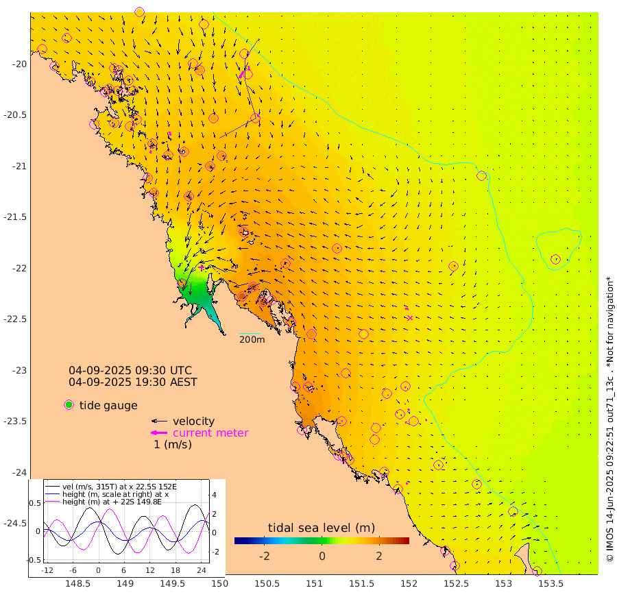 15cm/s -162T +10cm/s rms + 2cm/s 5T. Brampton I 18m 25cm/s 165T +9cm/s rms + 6cm/s 66T. Wigton I 38m 1cm/s -161T +7cm/s rms + 8cm/s 141T. Tern I 47m 27cm/s 178T +7cm/s rms + 12cm/s 54T. N Bugatti Rf 64m 49cm/s -151T +3cm/s rms + 13cm/s 178T. W Bugatti Rf 70m 16cm/s 164T +3cm/s rms + 3cm/s -130T. Creal Rf 69m 10cm/s -178T +7cm/s rms + 4cm/s 2T. North Rf 62m 9cm/s 26T +9cm/s rms + 2cm/s -56T. Cape Capricorn 26m 10cm/s 120T +5cm/s rms + 3cm/s 166T. L Musgrave I 42m 11cm/s 107T +9cm/s rms + 1cm/s -142T. Round Hill Hd 26m 1cm/s -122T +41cm/s rms + 48cm/s 116T. GBRELR 305m 22cm/s -73T +7cm/s rms + 6cm/s 123T. GBRCCH 92m 12cm/s 139T +8cm/s rms + 3cm/s -33T. GBRHIN 45m 9cm/s 99T +4cm/s rms + 2cm/s 41T. GBRHIS 46m 9cm/s 138T +16cm/s rms + 4cm/s -22T. GBROTE 59m 153cm Bell Cay 129cm Holbourne I 175cm Tern I 121cm Bugatti Rf 136cm Creal Rf 113cm White Tip I 116cm North Rf 145cm Rundle I 83cm L Musgrave I 74cm Saumarez Reef 119cm Kennedy Reef 113cm Unnamed Reef No. 2 130cm Abbot Point 133cm Bowen 133cm Tideway Reef 143cm Hayman Island 162cm Square Reef 130cm Double Bay 151cm Molle Island 148cm Cid Harbour 127cm Hook Island 136cm Border Island 134cm Haslewood Island 142cm Shute Harbour 147cm Thomas Island 166cm Credlin Reef 159cm East Repulse Island 159cm Blacksmith Island 154cm Laguna Quays 163cm Carlisle Island (Off) 165cm St. Bees Island 162cm Scawfell Island 186cm Penrith Island 175cm Mackay Outer Harbour 185cm Hay Point 186cm Prudhoe Island 196cm Middle Island (Percy Isles) 136cm Gannet Cay 77cm Elusive Reef 175cm Mcewin Islet 231cm Mumford Island 229cm Osborn Island 227cm Marquis Island 213cm Reef Point 174cm High Peak Island 175cm Port Clinton 179cm Peaked Island 113cm Karamea Bank 147cm Johnson Patch - NW 174cm Rosslyn Bay 177cm Middle Island (Keppel Isles) 189cm Port Alma 111cm Heron Island 122cm One Tree Islet 123cm Polmaise Reef 126cm Tryon Island 124cm Rock Cod Shoal 134cm Gatcombe Head 151cm Gladstone 144cm South Trees (Storm Surge) 111cm Clews Point 99cm Round Hill Head 76cm Lady Elliot Island 74cm Breaksea Spit 102cm Bundaberg (Burnett Heads) 108cm Elliot Heads 59cm Waddy Point (Fraser Island)