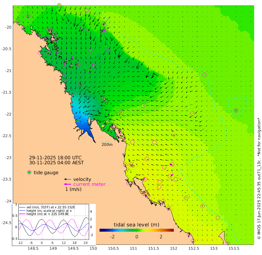 30cm/s -178T +10cm/s rms + 2cm/s 5T. Brampton I 18m 37cm/s 171T +9cm/s rms + 6cm/s 66T. Wigton I 38m 13cm/s -152T +7cm/s rms + 8cm/s 141T. Tern I 47m 47cm/s -165T +7cm/s rms + 12cm/s 54T. N Bugatti Rf 64m 60cm/s -146T +3cm/s rms + 13cm/s 178T. W Bugatti Rf 70m 22cm/s -172T +3cm/s rms + 3cm/s -130T. Creal Rf 69m 35cm/s -77T +7cm/s rms + 4cm/s 2T. North Rf 62m 34cm/s -29T +9cm/s rms + 2cm/s -56T. Cape Capricorn 26m 8cm/s -85T +5cm/s rms + 3cm/s 166T. L Musgrave I 42m 8cm/s -64T +9cm/s rms + 1cm/s -142T. Round Hill Hd 26m 4cm/s -117T +41cm/s rms + 48cm/s 116T. GBRELR 305m 27cm/s -67T +7cm/s rms + 6cm/s 123T. GBRCCH 92m 35cm/s -115T +8cm/s rms + 3cm/s -33T. GBRHIN 45m 15cm/s -97T +4cm/s rms + 2cm/s 41T. GBRHIS 46m 17cm/s -149T +16cm/s rms + 4cm/s -22T. GBROTE 59m 44cm Bell Cay 17cm Holbourne I 11cm Tern I 15cm Bugatti Rf 9cm Creal Rf 21cm White Tip I 67cm North Rf 90cm Rundle I 54cm L Musgrave I 28cm Saumarez Reef 30cm Kennedy Reef 32cm Unnamed Reef No. 2 21cm Abbot Point 17cm Bowen 3cm Tideway Reef 24cm Hayman Island -5cm Square Reef 16cm Double Bay -4cm Molle Island 9cm Cid Harbour 9cm Hook Island 1cm Border Island 0cm Haslewood Island 5cm Shute Harbour -5cm Thomas Island 10cm Credlin Reef 4cm East Repulse Island 1cm Blacksmith Island -17cm Laguna Quays 6cm Carlisle Island (Off) 14cm St. Bees Island 7cm Scawfell Island 15cm Penrith Island -4cm Mackay Outer Harbour 0cm Hay Point -4cm Prudhoe Island 34cm Middle Island (Percy Isles) 49cm Gannet Cay 34cm Elusive Reef -19cm Mcewin Islet 58cm Mumford Island 55cm Osborn Island 61cm Marquis Island 58cm Reef Point 50cm High Peak Island 75cm Port Clinton 78cm Peaked Island 72cm Karamea Bank 76cm Johnson Patch - NW 94cm Rosslyn Bay 96cm Middle Island (Keppel Isles) 100cm Port Alma 68cm Heron Island 73cm One Tree Islet 77cm Polmaise Reef 72cm Tryon Island 83cm Rock Cod Shoal 81cm Gatcombe Head 89cm Gladstone 90cm South Trees (Storm Surge) 77cm Clews Point 67cm Round Hill Head 51cm Lady Elliot Island 54cm Breaksea Spit 72cm Bundaberg (Burnett Heads) 78cm Elliot Heads 38cm Waddy Point (Fraser Island)