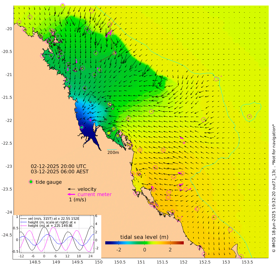 43cm/s -178T +10cm/s rms + 2cm/s 5T. Brampton I 18m 54cm/s 172T +9cm/s rms + 6cm/s 66T. Wigton I 38m 24cm/s -147T +7cm/s rms + 8cm/s 141T. Tern I 47m 71cm/s -165T +7cm/s rms + 12cm/s 54T. N Bugatti Rf 64m 91cm/s -147T +3cm/s rms + 13cm/s 178T. W Bugatti Rf 70m 33cm/s -167T +3cm/s rms + 3cm/s -130T. Creal Rf 69m 56cm/s -79T +7cm/s rms + 4cm/s 2T. North Rf 62m 53cm/s -30T +9cm/s rms + 2cm/s -56T. Cape Capricorn 26m 17cm/s -112T +5cm/s rms + 3cm/s 166T. L Musgrave I 42m 12cm/s -76T +9cm/s rms + 1cm/s -142T. Round Hill Hd 26m 7cm/s -109T +41cm/s rms + 48cm/s 116T. GBRELR 305m 49cm/s -68T +7cm/s rms + 6cm/s 123T. GBRCCH 92m 59cm/s -112T +8cm/s rms + 3cm/s -33T. GBRHIN 45m 32cm/s -96T +4cm/s rms + 2cm/s 41T. GBRHIS 46m 33cm/s -130T +16cm/s rms + 4cm/s -22T. GBROTE 59m 73cm Bell Cay 53cm Holbourne I 21cm Tern I 44cm Bugatti Rf 28cm Creal Rf 59cm White Tip I 122cm North Rf 151cm Rundle I 106cm L Musgrave I 79cm Saumarez Reef 68cm Kennedy Reef 78cm Unnamed Reef No. 2 56cm Abbot Point 48cm Bowen 27cm Tideway Reef 49cm Hayman Island 18cm Square Reef 46cm Double Bay 17cm Molle Island 23cm Cid Harbour 35cm Hook Island 16cm Border Island 10cm Haslewood Island 22cm Shute Harbour 2cm Thomas Island 25cm Credlin Reef 5cm East Repulse Island -5cm Blacksmith Island -23cm Laguna Quays 9cm Carlisle Island (Off) 6cm St. Bees Island -3cm Scawfell Island 14cm Penrith Island -12cm Mackay Outer Harbour -8cm Hay Point 0cm Prudhoe Island 47cm Middle Island (Percy Isles) 72cm Gannet Cay 82cm Elusive Reef -82cm Mcewin Islet 74cm Mumford Island 51cm Osborn Island 52cm Marquis Island 58cm Reef Point 70cm High Peak Island 120cm Port Clinton 137cm Peaked Island 132cm Karamea Bank 133cm Johnson Patch - NW 150cm Rosslyn Bay 157cm Middle Island (Keppel Isles) 151cm Port Alma 123cm Heron Island 140cm One Tree Islet 137cm Polmaise Reef 127cm Tryon Island 145cm Rock Cod Shoal 132cm Gatcombe Head 140cm Gladstone 144cm South Trees (Storm Surge) 138cm Clews Point 122cm Round Hill Head 104cm Lady Elliot Island 105cm Breaksea Spit 126cm Bundaberg (Burnett Heads) 128cm Elliot Heads 83cm Waddy Point (Fraser Island)