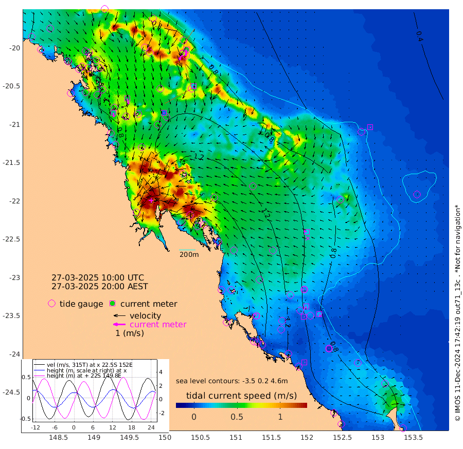 34cm/s 173T +10cm/s rms + 2cm/s 5T. Brampton I 18m 46cm/s 166T +9cm/s rms + 6cm/s 66T. Wigton I 38m 7cm/s 174T +7cm/s rms + 8cm/s 141T. Tern I 47m 52cm/s -172T +7cm/s rms + 12cm/s 54T. N Bugatti Rf 64m 68cm/s -154T +3cm/s rms + 13cm/s 178T. W Bugatti Rf 70m 25cm/s 167T +3cm/s rms + 3cm/s -130T. Creal Rf 69m 11cm/s -100T +7cm/s rms + 4cm/s 2T. North Rf 62m 19cm/s -13T +9cm/s rms + 2cm/s -56T. Cape Capricorn 26m 1cm/s 114T +5cm/s rms + 3cm/s 166T. L Musgrave I 42m 4cm/s 114T +9cm/s rms + 1cm/s -142T. Round Hill Hd 26m 5cm/s 172T +41cm/s rms + 48cm/s 116T. GBRELR 305m 23cm/s -73T +7cm/s rms + 6cm/s 123T. GBRCCH 92m 17cm/s -163T +8cm/s rms + 3cm/s -33T. GBRHIN 45m 5cm/s 111T +4cm/s rms + 2cm/s 41T. GBRHIS 46m 17cm/s 152T +16cm/s rms + 4cm/s -22T. GBROTE 59m 133cm Bell Cay 85cm Holbourne I 139cm Tern I 85cm Bugatti Rf 102cm Creal Rf 76cm White Tip I 103cm North Rf 141cm Rundle I 68cm L Musgrave I 56cm Saumarez Reef 86cm Kennedy Reef 79cm Unnamed Reef No. 2 91cm Abbot Point 92cm Bowen 87cm Tideway Reef 103cm Hayman Island 108cm Square Reef 96cm Double Bay 83cm Molle Island 106cm Cid Harbour 86cm Hook Island 86cm Border Island 92cm Haslewood Island 98cm Shute Harbour 103cm Thomas Island 125cm Credlin Reef 120cm East Repulse Island 117cm Blacksmith Island 103cm Laguna Quays 124cm Carlisle Island (Off) 149cm St. Bees Island 133cm Scawfell Island 144cm Penrith Island 130cm Mackay Outer Harbour 143cm Hay Point 145cm Prudhoe Island 168cm Middle Island (Percy Isles) 123cm Gannet Cay 46cm Elusive Reef 127cm Mcewin Islet 210cm Mumford Island 206cm Osborn Island 216cm Marquis Island 198cm Reef Point 160cm High Peak Island 170cm Port Clinton 180cm Peaked Island 107cm Karamea Bank 138cm Johnson Patch - NW 174cm Rosslyn Bay 179cm Middle Island (Keppel Isles) 195cm Port Alma 101cm Heron Island 103cm One Tree Islet 117cm Polmaise Reef 113cm Tryon Island 120cm Rock Cod Shoal 133cm Gatcombe Head 154cm Gladstone 147cm South Trees (Storm Surge) 106cm Clews Point 92cm Round Hill Head 61cm Lady Elliot Island 55cm Breaksea Spit 99cm Bundaberg (Burnett Heads) 108cm Elliot Heads 40cm Waddy Point (Fraser Island)