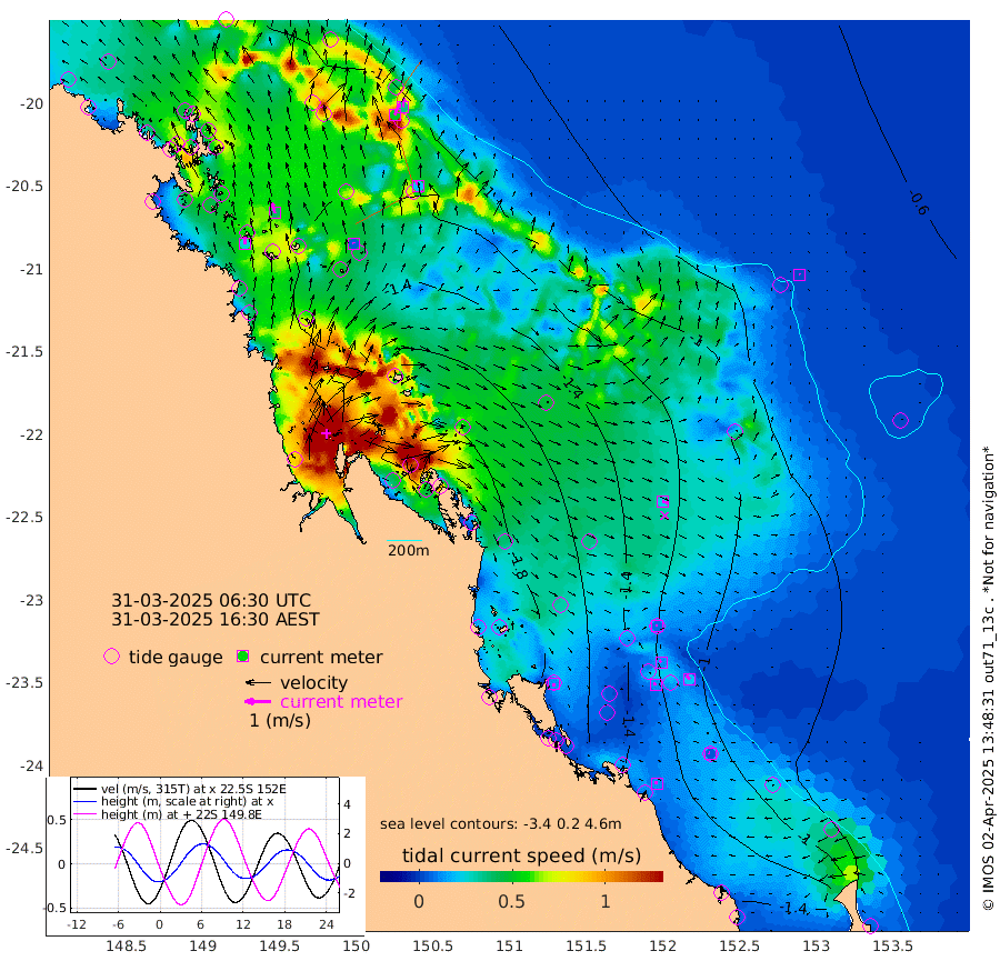 25cm/s -2T +10cm/s rms + 2cm/s 5T. Brampton I 18m 41cm/s -15T +9cm/s rms + 6cm/s 66T. Wigton I 38m 4cm/s -24T +7cm/s rms + 8cm/s 141T. Tern I 47m 36cm/s 5T +7cm/s rms + 12cm/s 54T. N Bugatti Rf 64m 51cm/s 24T +3cm/s rms + 13cm/s 178T. W Bugatti Rf 70m 21cm/s -20T +3cm/s rms + 3cm/s -130T. Creal Rf 69m 6cm/s -11T +7cm/s rms + 4cm/s 2T. North Rf 62m 12cm/s -174T +9cm/s rms + 2cm/s -56T. Cape Capricorn 26m 5cm/s -66T +5cm/s rms + 3cm/s 166T. L Musgrave I 42m 12cm/s -68T +9cm/s rms + 1cm/s -142T. Round Hill Hd 26m 3cm/s -25T +41cm/s rms + 48cm/s 116T. GBRELR 305m 23cm/s 104T +7cm/s rms + 6cm/s 123T. GBRCCH 92m 11cm/s -36T +8cm/s rms + 3cm/s -33T. GBRHIN 45m 12cm/s -70T +4cm/s rms + 2cm/s 41T. GBRHIS 46m 21cm/s -31T +16cm/s rms + 4cm/s -22T. GBROTE 59m -166cm Bell Cay -109cm Holbourne I -179cm Tern I -112cm Bugatti Rf -137cm Creal Rf -98cm White Tip I -126cm North Rf -165cm Rundle I -88cm L Musgrave I -77cm Saumarez Reef -103cm Kennedy Reef -97cm Unnamed Reef No. 2 -106cm Abbot Point -110cm Bowen -114cm Tideway Reef -120cm Hayman Island -142cm Square Reef -127cm Double Bay -120cm Molle Island -130cm Cid Harbour -118cm Hook Island -110cm Border Island -121cm Haslewood Island -127cm Shute Harbour -140cm Thomas Island -159cm Credlin Reef -153cm East Repulse Island -150cm Blacksmith Island -145cm Laguna Quays -162cm Carlisle Island (Off) -188cm St. Bees Island -159cm Scawfell Island -181cm Penrith Island -178cm Mackay Outer Harbour -193cm Hay Point -199cm Prudhoe Island -229cm Middle Island (Percy Isles) -154cm Gannet Cay -66cm Elusive Reef -199cm Mcewin Islet -242cm Mumford Island -240cm Osborn Island -256cm Marquis Island -232cm Reef Point -199cm High Peak Island -212cm Port Clinton -210cm Peaked Island -128cm Karamea Bank -176cm Johnson Patch - NW -203cm Rosslyn Bay -205cm Middle Island (Keppel Isles) -229cm Port Alma -126cm Heron Island -126cm One Tree Islet -140cm Polmaise Reef -138cm Tryon Island -141cm Rock Cod Shoal -159cm Gatcombe Head -184cm Gladstone -174cm South Trees (Storm Surge) -122cm Clews Point -113cm Round Hill Head -83cm Lady Elliot Island -76cm Breaksea Spit -123cm Bundaberg (Burnett Heads) -131cm Elliot Heads -57cm Waddy Point (Fraser Island)