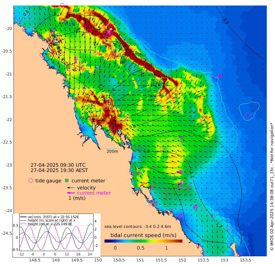 51cm/s 175T +10cm/s rms + 2cm/s 5T. Brampton I 18m 63cm/s 171T +9cm/s rms + 6cm/s 66T. Wigton I 38m 26cm/s -153T +7cm/s rms + 8cm/s 141T. Tern I 47m 80cm/s -166T +7cm/s rms + 12cm/s 54T. N Bugatti Rf 64m 101cm/s -148T +3cm/s rms + 13cm/s 178T. W Bugatti Rf 70m 38cm/s -171T +3cm/s rms + 3cm/s -130T. Creal Rf 69m 56cm/s -81T +7cm/s rms + 4cm/s 2T. North Rf 62m 55cm/s -30T +9cm/s rms + 2cm/s -56T. Cape Capricorn 26m 16cm/s -116T +5cm/s rms + 3cm/s 166T. L Musgrave I 42m 11cm/s -84T +9cm/s rms + 1cm/s -142T. Round Hill Hd 26m 7cm/s -129T +41cm/s rms + 48cm/s 116T. GBRELR 305m 52cm/s -70T +7cm/s rms + 6cm/s 123T. GBRCCH 92m 63cm/s -113T +8cm/s rms + 3cm/s -33T. GBRHIN 45m 34cm/s -96T +4cm/s rms + 2cm/s 41T. GBRHIS 46m 36cm/s -133T +16cm/s rms + 4cm/s -22T. GBROTE 59m 89cm Bell Cay 66cm Holbourne I 37cm Tern I 57cm Bugatti Rf 43cm Creal Rf 70cm White Tip I 135cm North Rf 168cm Rundle I 114cm L Musgrave I 96cm Saumarez Reef 80cm Kennedy Reef 90cm Unnamed Reef No. 2 70cm Abbot Point 61cm Bowen 41cm Tideway Reef 61cm Hayman Island 39cm Square Reef 59cm Double Bay 24cm Molle Island 36cm Cid Harbour 47cm Hook Island 27cm Border Island 21cm Haslewood Island 34cm Shute Harbour 13cm Thomas Island 40cm Credlin Reef 13cm East Repulse Island 6cm Blacksmith Island -14cm Laguna Quays 20cm Carlisle Island (Off) 22cm St. Bees Island 11cm Scawfell Island 29cm Penrith Island -1cm Mackay Outer Harbour 4cm Hay Point 20cm Prudhoe Island 66cm Middle Island (Percy Isles) 85cm Gannet Cay 88cm Elusive Reef -89cm Mcewin Islet 100cm Mumford Island 66cm Osborn Island 68cm Marquis Island 72cm Reef Point 89cm High Peak Island 141cm Port Clinton 167cm Peaked Island 147cm Karamea Bank 152cm Johnson Patch - NW 172cm Rosslyn Bay 181cm Middle Island (Keppel Isles) 176cm Port Alma 137cm Heron Island 154cm One Tree Islet 154cm Polmaise Reef 140cm Tryon Island 159cm Rock Cod Shoal 149cm Gatcombe Head 160cm Gladstone 163cm South Trees (Storm Surge) 153cm Clews Point 135cm Round Hill Head 112cm Lady Elliot Island 109cm Breaksea Spit 140cm Bundaberg (Burnett Heads) 144cm Elliot Heads 86cm Waddy Point (Fraser Island)