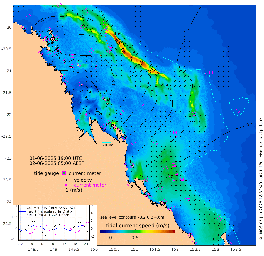 22cm/s -16T +10cm/s rms + 2cm/s 5T. Brampton I 18m 26cm/s -3T +9cm/s rms + 6cm/s 66T. Wigton I 38m 19cm/s 26T +7cm/s rms + 8cm/s 141T. Tern I 47m 36cm/s 30T +7cm/s rms + 12cm/s 54T. N Bugatti Rf 64m 29cm/s 38T +3cm/s rms + 13cm/s 178T. W Bugatti Rf 70m 14cm/s 35T +3cm/s rms + 3cm/s -130T. Creal Rf 69m 47cm/s 112T +7cm/s rms + 4cm/s 2T. North Rf 62m 37cm/s 140T +9cm/s rms + 2cm/s -56T. Cape Capricorn 26m 18cm/s 94T +5cm/s rms + 3cm/s 166T. L Musgrave I 42m 20cm/s 114T +9cm/s rms + 1cm/s -142T. Round Hill Hd 26m 4cm/s 68T +41cm/s rms + 48cm/s 116T. GBRELR 305m 16cm/s 120T +7cm/s rms + 6cm/s 123T. GBRCCH 92m 46cm/s 76T +8cm/s rms + 3cm/s -33T. GBRHIN 45m 28cm/s 89T +4cm/s rms + 2cm/s 41T. GBRHIS 46m 20cm/s 71T +16cm/s rms + 4cm/s -22T. GBROTE 59m 70cm Bell Cay 83cm Holbourne I 128cm Tern I 78cm Bugatti Rf 97cm Creal Rf 62cm White Tip I 9cm North Rf 10cm Rundle I -6cm L Musgrave I 8cm Saumarez Reef 56cm Kennedy Reef 55cm Unnamed Reef No. 2 85cm Abbot Point 92cm Bowen 105cm Tideway Reef 95cm Hayman Island 124cm Square Reef 113cm Double Bay 127cm Molle Island 106cm Cid Harbour 103cm Hook Island 106cm Border Island 114cm Haslewood Island 114cm Shute Harbour 126cm Thomas Island 130cm Credlin Reef 148cm East Repulse Island 127cm Blacksmith Island 151cm Laguna Quays 148cm Carlisle Island (Off) 152cm St. Bees Island 132cm Scawfell Island 139cm Penrith Island 156cm Mackay Outer Harbour 160cm Hay Point 157cm Prudhoe Island 119cm Middle Island (Percy Isles) 58cm Gannet Cay 19cm Elusive Reef 208cm Mcewin Islet 109cm Mumford Island 127cm Osborn Island 135cm Marquis Island 119cm Reef Point 90cm High Peak Island 62cm Port Clinton 47cm Peaked Island 5cm Karamea Bank 18cm Johnson Patch - NW 32cm Rosslyn Bay 32cm Middle Island (Keppel Isles) 41cm Port Alma 2cm Heron Island -5cm One Tree Islet -3cm Polmaise Reef 5cm Tryon Island 7cm Rock Cod Shoal 12cm Gatcombe Head 19cm Gladstone 11cm South Trees (Storm Surge) -14cm Clews Point -10cm Round Hill Head -10cm Lady Elliot Island -15cm Breaksea Spit -8cm Bundaberg (Burnett Heads) -12cm Elliot Heads -10cm Waddy Point (Fraser Island)