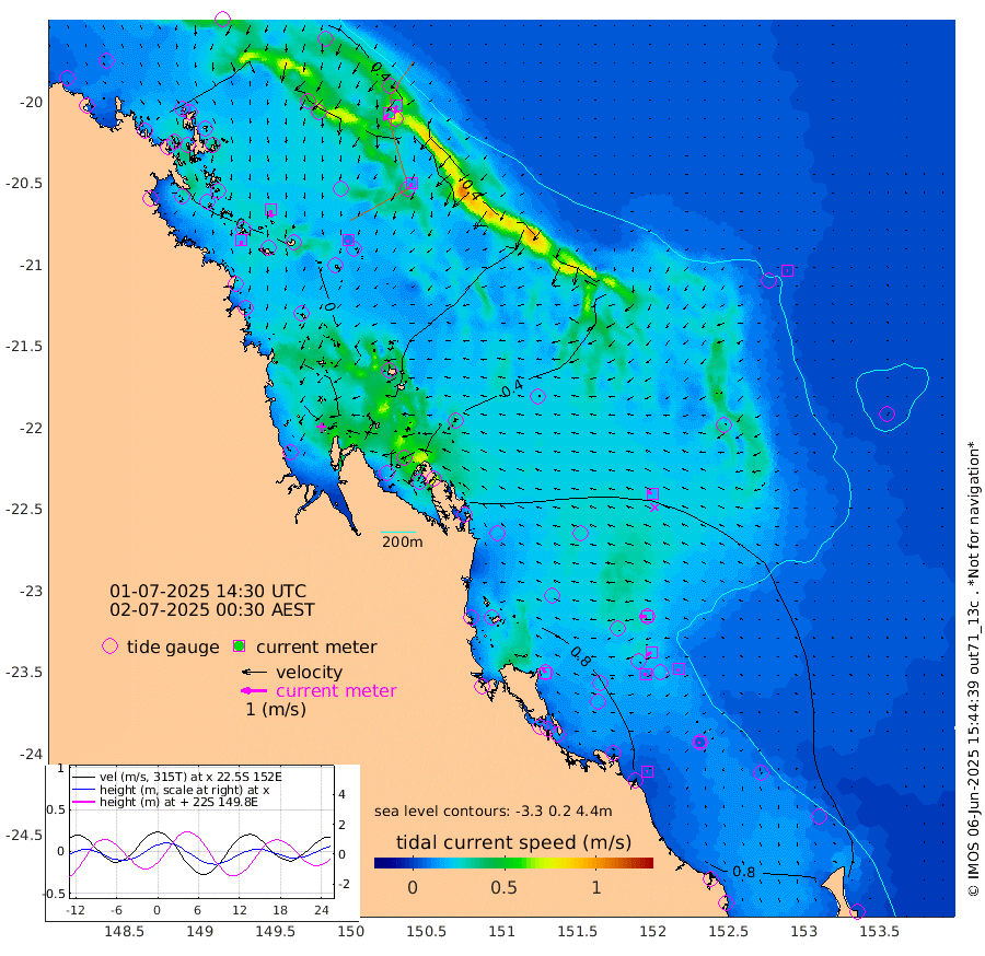 20cm/s 174T +10cm/s rms + 2cm/s 5T. Brampton I 18m 27cm/s 174T +9cm/s rms + 6cm/s 66T. Wigton I 38m 10cm/s -152T +7cm/s rms + 8cm/s 141T. Tern I 47m 30cm/s -160T +7cm/s rms + 12cm/s 54T. N Bugatti Rf 64m 32cm/s -145T +3cm/s rms + 13cm/s 178T. W Bugatti Rf 70m 15cm/s -166T +3cm/s rms + 3cm/s -130T. Creal Rf 69m 23cm/s -88T +7cm/s rms + 4cm/s 2T. North Rf 62m 21cm/s -35T +9cm/s rms + 2cm/s -56T. Cape Capricorn 26m 5cm/s -162T +5cm/s rms + 3cm/s 166T. L Musgrave I 42m 4cm/s -109T +9cm/s rms + 1cm/s -142T. Round Hill Hd 26m 3cm/s -101T +41cm/s rms + 48cm/s 116T. GBRELR 305m 20cm/s -70T +7cm/s rms + 6cm/s 123T. GBRCCH 92m 20cm/s -116T +8cm/s rms + 3cm/s -33T. GBRHIN 45m 11cm/s -95T +4cm/s rms + 2cm/s 41T. GBRHIS 46m 11cm/s -124T +16cm/s rms + 4cm/s -22T. GBROTE 59m 51cm Bell Cay 32cm Holbourne I 26cm Tern I 34cm Bugatti Rf 30cm Creal Rf 39cm White Tip I 72cm North Rf 86cm Rundle I 63cm L Musgrave I 51cm Saumarez Reef 39cm Kennedy Reef 40cm Unnamed Reef No. 2 27cm Abbot Point 24cm Bowen 20cm Tideway Reef 30cm Hayman Island 28cm Square Reef 22cm Double Bay 30cm Molle Island 21cm Cid Harbour 22cm Hook Island 17cm Border Island 14cm Haslewood Island 18cm Shute Harbour 11cm Thomas Island 20cm Credlin Reef -1cm East Repulse Island 15cm Blacksmith Island 2cm Laguna Quays 8cm Carlisle Island (Off) 4cm St. Bees Island 13cm Scawfell Island 31cm Penrith Island 11cm Mackay Outer Harbour 13cm Hay Point 18cm Prudhoe Island 58cm Middle Island (Percy Isles) 55cm Gannet Cay 46cm Elusive Reef -14cm Mcewin Islet 65cm Mumford Island 47cm Osborn Island 45cm Marquis Island 45cm Reef Point 54cm High Peak Island 76cm Port Clinton 78cm Peaked Island 72cm Karamea Bank 93cm Johnson Patch - NW 89cm Rosslyn Bay 88cm Middle Island (Keppel Isles) 94cm Port Alma 78cm Heron Island 86cm One Tree Islet 86cm Polmaise Reef 79cm Tryon Island 77cm Rock Cod Shoal 84cm Gatcombe Head 88cm Gladstone 88cm South Trees (Storm Surge) 82cm Clews Point 76cm Round Hill Head 62cm Lady Elliot Island 64cm Breaksea Spit 78cm Bundaberg (Burnett Heads) 85cm Elliot Heads 52cm Waddy Point (Fraser Island)