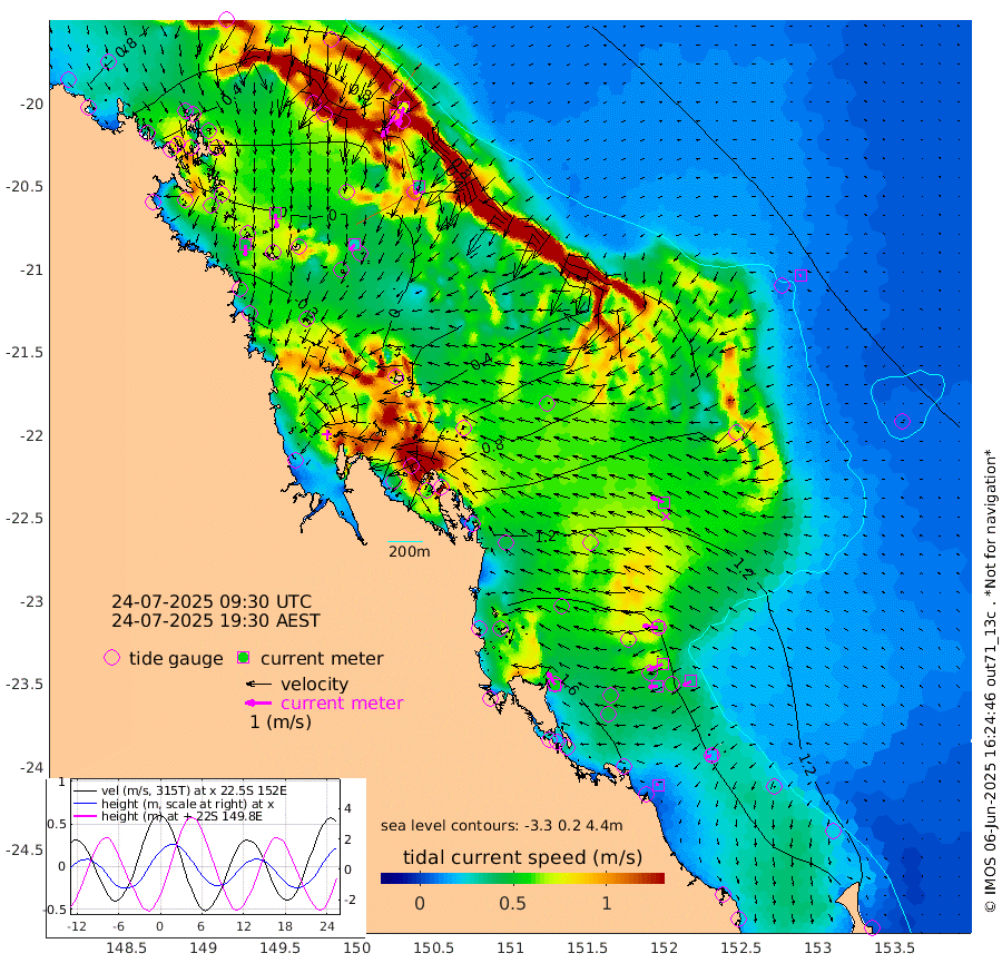 44cm/s -179T +10cm/s rms + 2cm/s 5T. Brampton I 18m 57cm/s 173T +9cm/s rms + 6cm/s 66T. Wigton I 38m 29cm/s -144T +7cm/s rms + 8cm/s 141T. Tern I 47m 75cm/s -163T +7cm/s rms + 12cm/s 54T. N Bugatti Rf 64m 97cm/s -148T +3cm/s rms + 13cm/s 178T. W Bugatti Rf 70m 34cm/s -161T +3cm/s rms + 3cm/s -130T. Creal Rf 69m 61cm/s -83T +7cm/s rms + 4cm/s 2T. North Rf 62m 56cm/s -30T +9cm/s rms + 2cm/s -56T. Cape Capricorn 26m 18cm/s -120T +5cm/s rms + 3cm/s 166T. L Musgrave I 42m 11cm/s -74T +9cm/s rms + 1cm/s -142T. Round Hill Hd 26m 8cm/s -101T +41cm/s rms + 48cm/s 116T. GBRELR 305m 53cm/s -67T +7cm/s rms + 6cm/s 123T. GBRCCH 92m 63cm/s -112T +8cm/s rms + 3cm/s -33T. GBRHIN 45m 36cm/s -95T +4cm/s rms + 2cm/s 41T. GBRHIS 46m 35cm/s -120T +16cm/s rms + 4cm/s -22T. GBROTE 59m 89cm Bell Cay 78cm Holbourne I 33cm Tern I 61cm Bugatti Rf 43cm Creal Rf 79cm White Tip I 143cm North Rf 171cm Rundle I 125cm L Musgrave I 96cm Saumarez Reef 87cm Kennedy Reef 99cm Unnamed Reef No. 2 73cm Abbot Point 64cm Bowen 41cm Tideway Reef 62cm Hayman Island 38cm Square Reef 68cm Double Bay 44cm Molle Island 30cm Cid Harbour 55cm Hook Island 26cm Border Island 18cm Haslewood Island 35cm Shute Harbour 10cm Thomas Island 30cm Credlin Reef 2cm East Repulse Island -4cm Blacksmith Island -16cm Laguna Quays 10cm Carlisle Island (Off) -1cm St. Bees Island 4cm Scawfell Island 23cm Penrith Island -6cm Mackay Outer Harbour -3cm Hay Point 17cm Prudhoe Island 68cm Middle Island (Percy Isles) 86cm Gannet Cay 101cm Elusive Reef -98cm Mcewin Islet 94cm Mumford Island 51cm Osborn Island 48cm Marquis Island 53cm Reef Point 79cm High Peak Island 142cm Port Clinton 159cm Peaked Island 150cm Karamea Bank 158cm Johnson Patch - NW 168cm Rosslyn Bay 175cm Middle Island (Keppel Isles) 167cm Port Alma 145cm Heron Island 170cm One Tree Islet 160cm Polmaise Reef 145cm Tryon Island 159cm Rock Cod Shoal 151cm Gatcombe Head 155cm Gladstone 162cm South Trees (Storm Surge) 160cm Clews Point 142cm Round Hill Head 124cm Lady Elliot Island 126cm Breaksea Spit 144cm Bundaberg (Burnett Heads) 144cm Elliot Heads 102cm Waddy Point (Fraser Island)