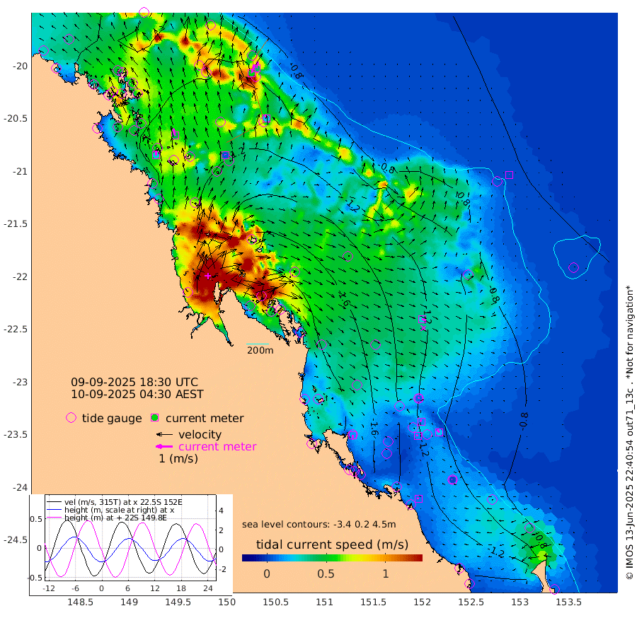 27cm/s -1T +10cm/s rms + 2cm/s 5T. Brampton I 18m 44cm/s -14T +9cm/s rms + 6cm/s 66T. Wigton I 38m 4cm/s -22T +7cm/s rms + 8cm/s 141T. Tern I 47m 41cm/s 7T +7cm/s rms + 12cm/s 54T. N Bugatti Rf 64m 55cm/s 24T +3cm/s rms + 13cm/s 178T. W Bugatti Rf 70m 23cm/s -19T +3cm/s rms + 3cm/s -130T. Creal Rf 69m 7cm/s 43T +7cm/s rms + 4cm/s 2T. North Rf 62m 15cm/s 178T +9cm/s rms + 2cm/s -56T. Cape Capricorn 26m 2cm/s -62T +5cm/s rms + 3cm/s 166T. L Musgrave I 42m 10cm/s -75T +9cm/s rms + 1cm/s -142T. Round Hill Hd 26m 2cm/s -18T +41cm/s rms + 48cm/s 116T. GBRELR 305m 25cm/s 108T +7cm/s rms + 6cm/s 123T. GBRCCH 92m 12cm/s -21T +8cm/s rms + 3cm/s -33T. GBRHIN 45m 11cm/s -69T +4cm/s rms + 2cm/s 41T. GBRHIS 46m 21cm/s -34T +16cm/s rms + 4cm/s -22T. GBROTE 59m -166cm Bell Cay -99cm Holbourne I -175cm Tern I -106cm Bugatti Rf -132cm Creal Rf -92cm White Tip I -128cm North Rf -168cm Rundle I -88cm L Musgrave I -73cm Saumarez Reef -94cm Kennedy Reef -90cm Unnamed Reef No. 2 -99cm Abbot Point -103cm Bowen -106cm Tideway Reef -117cm Hayman Island -134cm Square Reef -115cm Double Bay -110cm Molle Island -126cm Cid Harbour -109cm Hook Island -103cm Border Island -115cm Haslewood Island -120cm Shute Harbour -134cm Thomas Island -155cm Credlin Reef -149cm East Repulse Island -147cm Blacksmith Island -138cm Laguna Quays -157cm Carlisle Island (Off) -185cm St. Bees Island -160cm Scawfell Island -181cm Penrith Island -174cm Mackay Outer Harbour -190cm Hay Point -194cm Prudhoe Island -224cm Middle Island (Percy Isles) -154cm Gannet Cay -61cm Elusive Reef -194cm Mcewin Islet -246cm Mumford Island -246cm Osborn Island -263cm Marquis Island -237cm Reef Point -200cm High Peak Island -211cm Port Clinton -212cm Peaked Island -129cm Karamea Bank -177cm Johnson Patch - NW -206cm Rosslyn Bay -209cm Middle Island (Keppel Isles) -232cm Port Alma -127cm Heron Island -127cm One Tree Islet -141cm Polmaise Reef -142cm Tryon Island -143cm Rock Cod Shoal -162cm Gatcombe Head -186cm Gladstone -177cm South Trees (Storm Surge) -125cm Clews Point -115cm Round Hill Head -84cm Lady Elliot Island -78cm Breaksea Spit -123cm Bundaberg (Burnett Heads) -133cm Elliot Heads -59cm Waddy Point (Fraser Island)