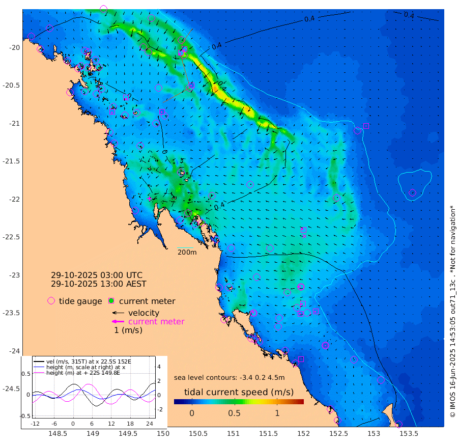13cm/s -164T +10cm/s rms + 2cm/s 5T. Brampton I 18m 20cm/s -178T +9cm/s rms + 6cm/s 66T. Wigton I 38m 10cm/s -134T +7cm/s rms + 8cm/s 141T. Tern I 47m 19cm/s -153T +7cm/s rms + 12cm/s 54T. N Bugatti Rf 64m 18cm/s -140T +3cm/s rms + 13cm/s 178T. W Bugatti Rf 70m 9cm/s -151T +3cm/s rms + 3cm/s -130T. Creal Rf 69m 25cm/s -80T +7cm/s rms + 4cm/s 2T. North Rf 62m 21cm/s -34T +9cm/s rms + 2cm/s -56T. Cape Capricorn 26m 6cm/s 162T +5cm/s rms + 3cm/s 166T. L Musgrave I 42m 3cm/s -95T +9cm/s rms + 1cm/s -142T. Round Hill Hd 26m 4cm/s -75T +41cm/s rms + 48cm/s 116T. GBRELR 305m 20cm/s -63T +7cm/s rms + 6cm/s 123T. GBRCCH 92m 22cm/s -108T +8cm/s rms + 3cm/s -33T. GBRHIN 45m 13cm/s -94T +4cm/s rms + 2cm/s 41T. GBRHIS 46m 12cm/s -104T +16cm/s rms + 4cm/s -22T. GBROTE 59m 38cm Bell Cay 14cm Holbourne I 12cm Tern I 23cm Bugatti Rf 17cm Creal Rf 29cm White Tip I 64cm North Rf 72cm Rundle I 59cm L Musgrave I 41cm Saumarez Reef 22cm Kennedy Reef 34cm Unnamed Reef No. 2 16cm Abbot Point 15cm Bowen 9cm Tideway Reef 15cm Hayman Island 6cm Square Reef 11cm Double Bay 18cm Molle Island 15cm Cid Harbour 11cm Hook Island 12cm Border Island 12cm Haslewood Island 9cm Shute Harbour 4cm Thomas Island 15cm Credlin Reef 9cm East Repulse Island 9cm Blacksmith Island -3cm Laguna Quays 12cm Carlisle Island (Off) 2cm St. Bees Island 8cm Scawfell Island 16cm Penrith Island 4cm Mackay Outer Harbour 6cm Hay Point -4cm Prudhoe Island 30cm Middle Island (Percy Isles) 45cm Gannet Cay 46cm Elusive Reef -5cm Mcewin Islet 31cm Mumford Island 38cm Osborn Island 42cm Marquis Island 42cm Reef Point 42cm High Peak Island 56cm Port Clinton 51cm Peaked Island 69cm Karamea Bank 71cm Johnson Patch - NW 74cm Rosslyn Bay 73cm Middle Island (Keppel Isles) 76cm Port Alma 71cm Heron Island 70cm One Tree Islet 70cm Polmaise Reef 75cm Tryon Island 78cm Rock Cod Shoal 71cm Gatcombe Head 75cm Gladstone 76cm South Trees (Storm Surge) 69cm Clews Point 69cm Round Hill Head 61cm Lady Elliot Island 64cm Breaksea Spit 69cm Bundaberg (Burnett Heads) 74cm Elliot Heads 54cm Waddy Point (Fraser Island)
