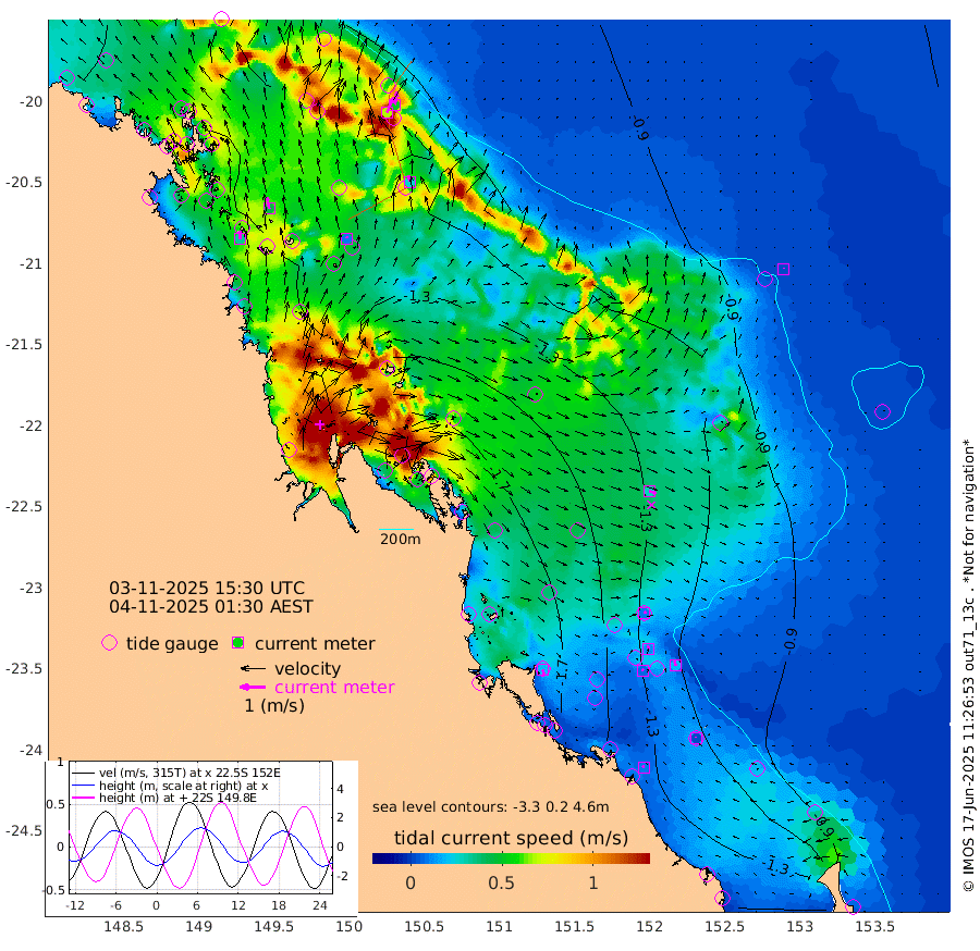 32cm/s -2T +10cm/s rms + 2cm/s 5T. Brampton I 18m 46cm/s -13T +9cm/s rms + 6cm/s 66T. Wigton I 38m 8cm/s 13T +7cm/s rms + 8cm/s 141T. Tern I 47m 51cm/s 8T +7cm/s rms + 12cm/s 54T. N Bugatti Rf 64m 67cm/s 26T +3cm/s rms + 13cm/s 178T. W Bugatti Rf 70m 26cm/s -8T +3cm/s rms + 3cm/s -130T. Creal Rf 69m 10cm/s 58T +7cm/s rms + 4cm/s 2T. North Rf 62m 18cm/s 169T +9cm/s rms + 2cm/s -56T. Cape Capricorn 26m 3cm/s -23T +5cm/s rms + 3cm/s 166T. L Musgrave I 42m 9cm/s -63T +9cm/s rms + 1cm/s -142T. Round Hill Hd 26m 3cm/s -3T +41cm/s rms + 48cm/s 116T. GBRELR 305m 28cm/s 106T +7cm/s rms + 6cm/s 123T. GBRCCH 92m 12cm/s 14T +8cm/s rms + 3cm/s -33T. GBRHIN 45m 6cm/s -48T +4cm/s rms + 2cm/s 41T. GBRHIS 46m 18cm/s -18T +16cm/s rms + 4cm/s -22T. GBROTE 59m -161cm Bell Cay -121cm Holbourne I -168cm Tern I -119cm Bugatti Rf -133cm Creal Rf -111cm White Tip I -134cm North Rf -172cm Rundle I -95cm L Musgrave I -80cm Saumarez Reef -118cm Kennedy Reef -115cm Unnamed Reef No. 2 -126cm Abbot Point -127cm Bowen -120cm Tideway Reef -136cm Hayman Island -144cm Square Reef -136cm Double Bay -136cm Molle Island -137cm Cid Harbour -124cm Hook Island -115cm Border Island -124cm Haslewood Island -132cm Shute Harbour -134cm Thomas Island -156cm Credlin Reef -151cm East Repulse Island -144cm Blacksmith Island -135cm Laguna Quays -157cm Carlisle Island (Off) -175cm St. Bees Island -156cm Scawfell Island -176cm Penrith Island -161cm Mackay Outer Harbour -173cm Hay Point -176cm Prudhoe Island -204cm Middle Island (Percy Isles) -149cm Gannet Cay -79cm Elusive Reef -149cm Mcewin Islet -236cm Mumford Island -229cm Osborn Island -239cm Marquis Island -222cm Reef Point -188cm High Peak Island -203cm Port Clinton -208cm Peaked Island -136cm Karamea Bank -173cm Johnson Patch - NW -205cm Rosslyn Bay -209cm Middle Island (Keppel Isles) -225cm Port Alma -132cm Heron Island -135cm One Tree Islet -145cm Polmaise Reef -146cm Tryon Island -151cm Rock Cod Shoal -163cm Gatcombe Head -183cm Gladstone -176cm South Trees (Storm Surge) -132cm Clews Point -119cm Round Hill Head -88cm Lady Elliot Island -84cm Breaksea Spit -126cm Bundaberg (Burnett Heads) -135cm Elliot Heads -64cm Waddy Point (Fraser Island)