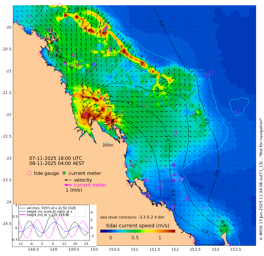 29cm/s -7T +10cm/s rms + 2cm/s 5T. Brampton I 18m 41cm/s -14T +9cm/s rms + 6cm/s 66T. Wigton I 38m 10cm/s 17T +7cm/s rms + 8cm/s 141T. Tern I 47m 37cm/s 7T +7cm/s rms + 12cm/s 54T. N Bugatti Rf 64m 52cm/s 28T +3cm/s rms + 13cm/s 178T. W Bugatti Rf 70m 21cm/s -6T +3cm/s rms + 3cm/s -130T. Creal Rf 69m 7cm/s 32T +7cm/s rms + 4cm/s 2T. North Rf 62m 15cm/s 165T +9cm/s rms + 2cm/s -56T. Cape Capricorn 26m 9cm/s -51T +5cm/s rms + 3cm/s 166T. L Musgrave I 42m 10cm/s -52T +9cm/s rms + 1cm/s -142T. Round Hill Hd 26m 3cm/s -7T +41cm/s rms + 48cm/s 116T. GBRELR 305m 25cm/s 100T +7cm/s rms + 6cm/s 123T. GBRCCH 92m 10cm/s 35T +8cm/s rms + 3cm/s -33T. GBRHIN 45m 5cm/s -7T +4cm/s rms + 2cm/s 41T. GBRHIS 46m 20cm/s 5T +16cm/s rms + 4cm/s -22T. GBROTE 59m -140cm Bell Cay -112cm Holbourne I -140cm Tern I -106cm Bugatti Rf -116cm Creal Rf -100cm White Tip I -123cm North Rf -155cm Rundle I -92cm L Musgrave I -89cm Saumarez Reef -110cm Kennedy Reef -106cm Unnamed Reef No. 2 -109cm Abbot Point -109cm Bowen -106cm Tideway Reef -109cm Hayman Island -125cm Square Reef -121cm Double Bay -113cm Molle Island -112cm Cid Harbour -111cm Hook Island -101cm Border Island -104cm Haslewood Island -111cm Shute Harbour -111cm Thomas Island -130cm Credlin Reef -118cm East Repulse Island -116cm Blacksmith Island -109cm Laguna Quays -128cm Carlisle Island (Off) -141cm St. Bees Island -119cm Scawfell Island -137cm Penrith Island -129cm Mackay Outer Harbour -138cm Hay Point -147cm Prudhoe Island -179cm Middle Island (Percy Isles) -129cm Gannet Cay -79cm Elusive Reef -115cm Mcewin Islet -189cm Mumford Island -177cm Osborn Island -187cm Marquis Island -174cm Reef Point -161cm High Peak Island -183cm Port Clinton -185cm Peaked Island -127cm Karamea Bank -161cm Johnson Patch - NW -182cm Rosslyn Bay -185cm Middle Island (Keppel Isles) -201cm Port Alma -124cm Heron Island -129cm One Tree Islet -137cm Polmaise Reef -131cm Tryon Island -139cm Rock Cod Shoal -147cm Gatcombe Head -168cm Gladstone -162cm South Trees (Storm Surge) -123cm Clews Point -114cm Round Hill Head -89cm Lady Elliot Island -83cm Breaksea Spit -125cm Bundaberg (Burnett Heads) -132cm Elliot Heads -61cm Waddy Point (Fraser Island)
