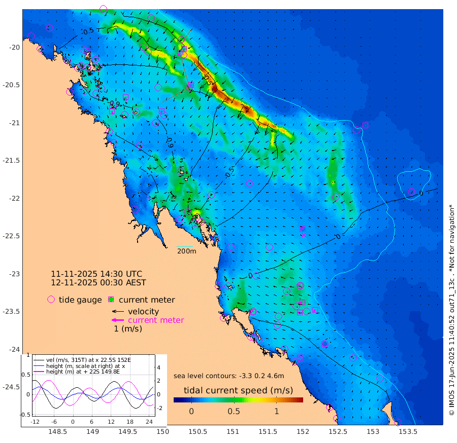 26cm/s 161T +10cm/s rms + 2cm/s 5T. Brampton I 18m 28cm/s 171T +9cm/s rms + 6cm/s 66T. Wigton I 38m 16cm/s -161T +7cm/s rms + 8cm/s 141T. Tern I 47m 32cm/s -155T +7cm/s rms + 12cm/s 54T. N Bugatti Rf 64m 31cm/s -142T +3cm/s rms + 13cm/s 178T. W Bugatti Rf 70m 14cm/s -156T +3cm/s rms + 3cm/s -130T. Creal Rf 69m 30cm/s -67T +7cm/s rms + 4cm/s 2T. North Rf 62m 29cm/s -37T +9cm/s rms + 2cm/s -56T. Cape Capricorn 26m 6cm/s -71T +5cm/s rms + 3cm/s 166T. L Musgrave I 42m 13cm/s -66T +9cm/s rms + 1cm/s -142T. Round Hill Hd 26m 4cm/s -153T +41cm/s rms + 48cm/s 116T. GBRELR 305m 10cm/s -75T +7cm/s rms + 6cm/s 123T. GBRCCH 92m 35cm/s -103T +8cm/s rms + 3cm/s -33T. GBRHIN 45m 20cm/s -93T +4cm/s rms + 2cm/s 41T. GBRHIS 46m 19cm/s -130T +16cm/s rms + 4cm/s -22T. GBROTE 59m -36cm Bell Cay -45cm Holbourne I -80cm Tern I -51cm Bugatti Rf -62cm Creal Rf -41cm White Tip I 2cm North Rf 10cm Rundle I 7cm L Musgrave I -2cm Saumarez Reef -27cm Kennedy Reef -32cm Unnamed Reef No. 2 -53cm Abbot Point -58cm Bowen -70cm Tideway Reef -63cm Hayman Island -86cm Square Reef -64cm Double Bay -86cm Molle Island -75cm Cid Harbour -61cm Hook Island -71cm Border Island -77cm Haslewood Island -75cm Shute Harbour -86cm Thomas Island -87cm Credlin Reef -101cm East Repulse Island -90cm Blacksmith Island -103cm Laguna Quays -95cm Carlisle Island (Off) -101cm St. Bees Island -94cm Scawfell Island -91cm Penrith Island -103cm Mackay Outer Harbour -104cm Hay Point -97cm Prudhoe Island -57cm Middle Island (Percy Isles) -24cm Gannet Cay -12cm Elusive Reef -126cm Mcewin Islet -59cm Mumford Island -75cm Osborn Island -76cm Marquis Island -69cm Reef Point -44cm High Peak Island -14cm Port Clinton -13cm Peaked Island 6cm Karamea Bank 6cm Johnson Patch - NW 1cm Rosslyn Bay -1cm Middle Island (Keppel Isles) 1cm Port Alma 7cm Heron Island 13cm One Tree Islet 15cm Polmaise Reef -2cm Tryon Island 7cm Rock Cod Shoal 9cm Gatcombe Head 11cm Gladstone 15cm South Trees (Storm Surge) 20cm Clews Point 16cm Round Hill Head 9cm Lady Elliot Island 9cm Breaksea Spit 22cm Bundaberg (Burnett Heads) 23cm Elliot Heads 0cm Waddy Point (Fraser Island)
