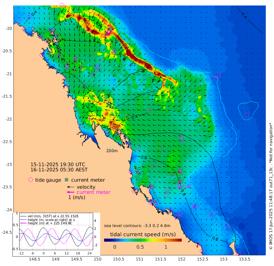 33cm/s -180T +10cm/s rms + 2cm/s 5T. Brampton I 18m 41cm/s 171T +9cm/s rms + 6cm/s 66T. Wigton I 38m 16cm/s -149T +7cm/s rms + 8cm/s 141T. Tern I 47m 57cm/s -167T +7cm/s rms + 12cm/s 54T. N Bugatti Rf 64m 73cm/s -148T +3cm/s rms + 13cm/s 178T. W Bugatti Rf 70m 26cm/s -167T +3cm/s rms + 3cm/s -130T. Creal Rf 69m 36cm/s -80T +7cm/s rms + 4cm/s 2T. North Rf 62m 39cm/s -27T +9cm/s rms + 2cm/s -56T. Cape Capricorn 26m 9cm/s -106T +5cm/s rms + 3cm/s 166T. L Musgrave I 42m 8cm/s -69T +9cm/s rms + 1cm/s -142T. Round Hill Hd 26m 5cm/s -116T +41cm/s rms + 48cm/s 116T. GBRELR 305m 32cm/s -67T +7cm/s rms + 6cm/s 123T. GBRCCH 92m 38cm/s -116T +8cm/s rms + 3cm/s -33T. GBRHIN 45m 18cm/s -95T +4cm/s rms + 2cm/s 41T. GBRHIS 46m 19cm/s -141T +16cm/s rms + 4cm/s -22T. GBROTE 59m 57cm Bell Cay 41cm Holbourne I 24cm Tern I 30cm Bugatti Rf 23cm Creal Rf 38cm White Tip I 81cm North Rf 106cm Rundle I 66cm L Musgrave I 43cm Saumarez Reef 56cm Kennedy Reef 50cm Unnamed Reef No. 2 38cm Abbot Point 32cm Bowen 19cm Tideway Reef 38cm Hayman Island 16cm Square Reef 32cm Double Bay 11cm Molle Island 13cm Cid Harbour 29cm Hook Island 10cm Border Island 1cm Haslewood Island 16cm Shute Harbour 4cm Thomas Island 18cm Credlin Reef -1cm East Repulse Island -4cm Blacksmith Island -12cm Laguna Quays 4cm Carlisle Island (Off) 3cm St. Bees Island -2cm Scawfell Island 19cm Penrith Island 1cm Mackay Outer Harbour 5cm Hay Point 18cm Prudhoe Island 55cm Middle Island (Percy Isles) 58cm Gannet Cay 48cm Elusive Reef -36cm Mcewin Islet 78cm Mumford Island 53cm Osborn Island 49cm Marquis Island 50cm Reef Point 57cm High Peak Island 98cm Port Clinton 106cm Peaked Island 86cm Karamea Bank 98cm Johnson Patch - NW 110cm Rosslyn Bay 113cm Middle Island (Keppel Isles) 114cm Port Alma 79cm Heron Island 98cm One Tree Islet 96cm Polmaise Reef 83cm Tryon Island 91cm Rock Cod Shoal 93cm Gatcombe Head 101cm Gladstone 102cm South Trees (Storm Surge) 97cm Clews Point 80cm Round Hill Head 62cm Lady Elliot Island 65cm Breaksea Spit 84cm Bundaberg (Burnett Heads) 82cm Elliot Heads 47cm Waddy Point (Fraser Island)