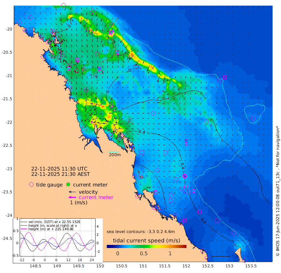 28cm/s 156T +10cm/s rms + 2cm/s 5T. Brampton I 18m 35cm/s 167T +9cm/s rms + 6cm/s 66T. Wigton I 38m 12cm/s -179T +7cm/s rms + 8cm/s 141T. Tern I 47m 32cm/s -165T +7cm/s rms + 12cm/s 54T. N Bugatti Rf 64m 34cm/s -152T +3cm/s rms + 13cm/s 178T. W Bugatti Rf 70m 18cm/s 175T +3cm/s rms + 3cm/s -130T. Creal Rf 69m 10cm/s -72T +7cm/s rms + 4cm/s 2T. North Rf 62m 16cm/s -31T +9cm/s rms + 2cm/s -56T. Cape Capricorn 26m 2cm/s -43T +5cm/s rms + 3cm/s 166T. L Musgrave I 42m 4cm/s -37T +9cm/s rms + 1cm/s -142T. Round Hill Hd 26m 5cm/s 163T +41cm/s rms + 48cm/s 116T. GBRELR 305m 10cm/s -87T +7cm/s rms + 6cm/s 123T. GBRCCH 92m 18cm/s -120T +8cm/s rms + 3cm/s -33T. GBRHIN 45m 8cm/s -104T +4cm/s rms + 2cm/s 41T. GBRHIS 46m 15cm/s -162T +16cm/s rms + 4cm/s -22T. GBROTE 59m 34cm Bell Cay 4cm Holbourne I 17cm Tern I 5cm Bugatti Rf 10cm Creal Rf 3cm White Tip I 33cm North Rf 54cm Rundle I 22cm L Musgrave I 22cm Saumarez Reef 14cm Kennedy Reef 5cm Unnamed Reef No. 2 5cm Abbot Point 4cm Bowen -5cm Tideway Reef 3cm Hayman Island 3cm Square Reef -15cm Double Bay -10cm Molle Island 12cm Cid Harbour -4cm Hook Island 3cm Border Island 4cm Haslewood Island 0cm Shute Harbour -2cm Thomas Island 7cm Credlin Reef -1cm East Repulse Island 10cm Blacksmith Island -7cm Laguna Quays 5cm Carlisle Island (Off) 9cm St. Bees Island 15cm Scawfell Island 17cm Penrith Island 3cm Mackay Outer Harbour 7cm Hay Point 5cm Prudhoe Island 34cm Middle Island (Percy Isles) 34cm Gannet Cay 0cm Elusive Reef -16cm Mcewin Islet 59cm Mumford Island 56cm Osborn Island 58cm Marquis Island 53cm Reef Point 41cm High Peak Island 51cm Port Clinton 59cm Peaked Island 35cm Karamea Bank 50cm Johnson Patch - NW 64cm Rosslyn Bay 64cm Middle Island (Keppel Isles) 75cm Port Alma 36cm Heron Island 35cm One Tree Islet 45cm Polmaise Reef 37cm Tryon Island 42cm Rock Cod Shoal 52cm Gatcombe Head 63cm Gladstone 61cm South Trees (Storm Surge) 43cm Clews Point 38cm Round Hill Head 20cm Lady Elliot Island 13cm Breaksea Spit 46cm Bundaberg (Burnett Heads) 55cm Elliot Heads 5cm Waddy Point (Fraser Island)