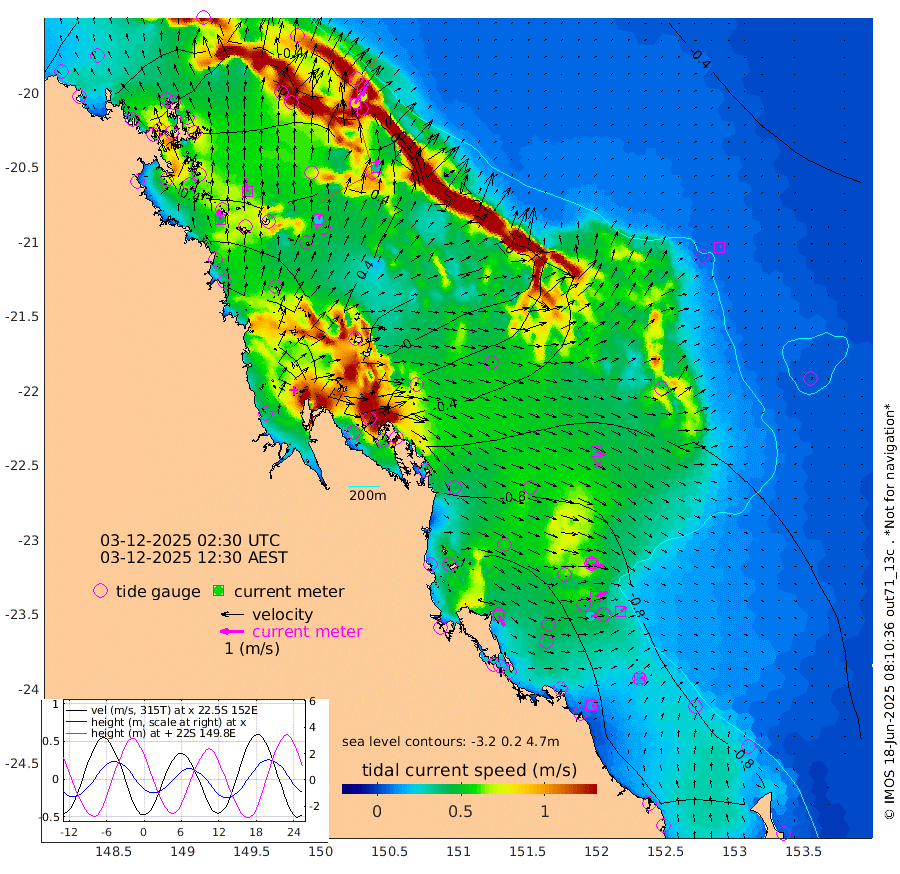 45cm/s -9T +10cm/s rms + 2cm/s 5T. Brampton I 18m 57cm/s -9T +9cm/s rms + 6cm/s 66T. Wigton I 38m 23cm/s 23T +7cm/s rms + 8cm/s 141T. Tern I 47m 72cm/s 18T +7cm/s rms + 12cm/s 54T. N Bugatti Rf 64m 85cm/s 31T +3cm/s rms + 13cm/s 178T. W Bugatti Rf 70m 32cm/s 8T +3cm/s rms + 3cm/s -130T. Creal Rf 69m 54cm/s 104T +7cm/s rms + 4cm/s 2T. North Rf 62m 52cm/s 151T +9cm/s rms + 2cm/s -56T. Cape Capricorn 26m 17cm/s 84T +5cm/s rms + 3cm/s 166T. L Musgrave I 42m 14cm/s 120T +9cm/s rms + 1cm/s -142T. Round Hill Hd 26m 6cm/s 45T +41cm/s rms + 48cm/s 116T. GBRELR 305m 41cm/s 113T +7cm/s rms + 6cm/s 123T. GBRCCH 92m 56cm/s 70T +8cm/s rms + 3cm/s -33T. GBRHIN 45m 29cm/s 83T +4cm/s rms + 2cm/s 41T. GBRHIS 46m 30cm/s 48T +16cm/s rms + 4cm/s -22T. GBROTE 59m -48cm Bell Cay -17cm Holbourne I 5cm Tern I -9cm Bugatti Rf 0cm Creal Rf -20cm White Tip I -88cm North Rf -119cm Rundle I -73cm L Musgrave I -52cm Saumarez Reef -25cm Kennedy Reef -37cm Unnamed Reef No. 2 -18cm Abbot Point -11cm Bowen 11cm Tideway Reef -10cm Hayman Island 18cm Square Reef -8cm Double Bay 24cm Molle Island 12cm Cid Harbour 1cm Hook Island 18cm Border Island 17cm Haslewood Island 11cm Shute Harbour 29cm Thomas Island 9cm Credlin Reef 27cm East Repulse Island 39cm Blacksmith Island 50cm Laguna Quays 19cm Carlisle Island (Off) 29cm St. Bees Island 27cm Scawfell Island 12cm Penrith Island 37cm Mackay Outer Harbour 32cm Hay Point 20cm Prudhoe Island -23cm Middle Island (Percy Isles) -51cm Gannet Cay -41cm Elusive Reef 98cm Mcewin Islet -51cm Mumford Island -27cm Osborn Island -31cm Marquis Island -33cm Reef Point -47cm High Peak Island -94cm Port Clinton -109cm Peaked Island -98cm Karamea Bank -99cm Johnson Patch - NW -120cm Rosslyn Bay -126cm Middle Island (Keppel Isles) -124cm Port Alma -90cm Heron Island -100cm One Tree Islet -103cm Polmaise Reef -84cm Tryon Island -110cm Rock Cod Shoal -105cm Gatcombe Head -112cm Gladstone -116cm South Trees (Storm Surge) -105cm Clews Point -91cm Round Hill Head -71cm Lady Elliot Island -64cm Breaksea Spit -96cm Bundaberg (Burnett Heads) -99cm Elliot Heads -51cm Waddy Point (Fraser Island)