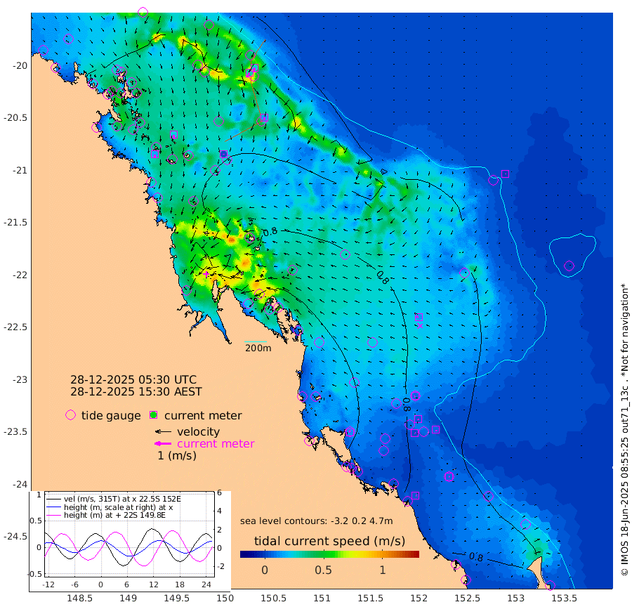 17cm/s 178T +10cm/s rms + 2cm/s 5T. Brampton I 18m 24cm/s 171T +9cm/s rms + 6cm/s 66T. Wigton I 38m 3cm/s -177T +7cm/s rms + 8cm/s 141T. Tern I 47m 26cm/s -170T +7cm/s rms + 12cm/s 54T. N Bugatti Rf 64m 29cm/s -152T +3cm/s rms + 13cm/s 178T. W Bugatti Rf 70m 15cm/s 177T +3cm/s rms + 3cm/s -130T. Creal Rf 69m 6cm/s -130T +7cm/s rms + 4cm/s 2T. North Rf 62m 11cm/s -19T +9cm/s rms + 2cm/s -56T. Cape Capricorn 26m 6cm/s 117T +5cm/s rms + 3cm/s 166T. L Musgrave I 42m 4cm/s 122T +9cm/s rms + 1cm/s -142T. Round Hill Hd 26m 1cm/s 165T +41cm/s rms + 48cm/s 116T. GBRELR 305m 13cm/s -73T +7cm/s rms + 6cm/s 123T. GBRCCH 92m 6cm/s 173T +8cm/s rms + 3cm/s -33T. GBRHIN 45m 3cm/s 118T +4cm/s rms + 2cm/s 41T. GBRHIS 46m 7cm/s 156T +16cm/s rms + 4cm/s -22T. GBROTE 59m 88cm Bell Cay 61cm Holbourne I 87cm Tern I 62cm Bugatti Rf 69cm Creal Rf 57cm White Tip I 75cm North Rf 98cm Rundle I 54cm L Musgrave I 40cm Saumarez Reef 57cm Kennedy Reef 59cm Unnamed Reef No. 2 62cm Abbot Point 62cm Bowen 58cm Tideway Reef 69cm Hayman Island 68cm Square Reef 69cm Double Bay 79cm Molle Island 68cm Cid Harbour 64cm Hook Island 59cm Border Island 67cm Haslewood Island 66cm Shute Harbour 65cm Thomas Island 80cm Credlin Reef 79cm East Repulse Island 70cm Blacksmith Island 70cm Laguna Quays 87cm Carlisle Island (Off) 80cm St. Bees Island 76cm Scawfell Island 96cm Penrith Island 85cm Mackay Outer Harbour 92cm Hay Point 87cm Prudhoe Island 114cm Middle Island (Percy Isles) 89cm Gannet Cay 44cm Elusive Reef 98cm Mcewin Islet 121cm Mumford Island 127cm Osborn Island 135cm Marquis Island 123cm Reef Point 107cm High Peak Island 116cm Port Clinton 104cm Peaked Island 77cm Karamea Bank 98cm Johnson Patch - NW 116cm Rosslyn Bay 115cm Middle Island (Keppel Isles) 131cm Port Alma 77cm Heron Island 73cm One Tree Islet 81cm Polmaise Reef 79cm Tryon Island 89cm Rock Cod Shoal 97cm Gatcombe Head 109cm Gladstone 104cm South Trees (Storm Surge) 73cm Clews Point 70cm Round Hill Head 50cm Lady Elliot Island 46cm Breaksea Spit 76cm Bundaberg (Burnett Heads) 80cm Elliot Heads 35cm Waddy Point (Fraser Island)