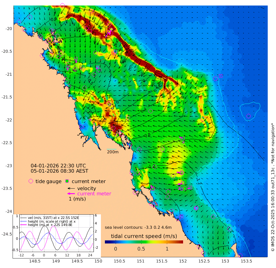 43cm/s 178T +10cm/s rms + 2cm/s 5T. Brampton I 18m 56cm/s 174T +9cm/s rms + 6cm/s 66T. Wigton I 38m 30cm/s -145T +7cm/s rms + 8cm/s 141T. Tern I 47m 73cm/s -162T +7cm/s rms + 12cm/s 54T. N Bugatti Rf 64m 90cm/s -148T +3cm/s rms + 13cm/s 178T. W Bugatti Rf 70m 33cm/s -159T +3cm/s rms + 3cm/s -130T. Creal Rf 69m 64cm/s -82T +7cm/s rms + 4cm/s 2T. North Rf 62m 57cm/s -32T +9cm/s rms + 2cm/s -56T. Cape Capricorn 26m 20cm/s -116T +5cm/s rms + 3cm/s 166T. L Musgrave I 42m 14cm/s -77T +9cm/s rms + 1cm/s -142T. Round Hill Hd 26m 8cm/s -102T +41cm/s rms + 48cm/s 116T. GBRELR 305m 51cm/s -67T +7cm/s rms + 6cm/s 123T. GBRCCH 92m 66cm/s -110T +8cm/s rms + 3cm/s -33T. GBRHIN 45m 40cm/s -94T +4cm/s rms + 2cm/s 41T. GBRHIS 46m 37cm/s -117T +16cm/s rms + 4cm/s -22T. GBROTE 59m 65cm Bell Cay 55cm Holbourne I 1cm Tern I 42cm Bugatti Rf 20cm Creal Rf 62cm White Tip I 129cm North Rf 153cm Rundle I 118cm L Musgrave I 92cm Saumarez Reef 66cm Kennedy Reef 81cm Unnamed Reef No. 2 50cm Abbot Point 40cm Bowen 17cm Tideway Reef 37cm Hayman Island 13cm Square Reef 39cm Double Bay 15cm Molle Island 5cm Cid Harbour 29cm Hook Island 2cm Border Island -6cm Haslewood Island 8cm Shute Harbour -17cm Thomas Island 0cm Credlin Reef -31cm East Repulse Island -31cm Blacksmith Island -47cm Laguna Quays -23cm Carlisle Island (Off) -33cm St. Bees Island -24cm Scawfell Island -10cm Penrith Island -40cm Mackay Outer Harbour -39cm Hay Point -19cm Prudhoe Island 33cm Middle Island (Percy Isles) 63cm Gannet Cay 90cm Elusive Reef -143cm Mcewin Islet 57cm Mumford Island 11cm Osborn Island 7cm Marquis Island 16cm Reef Point 50cm High Peak Island 113cm Port Clinton 134cm Peaked Island 136cm Karamea Bank 141cm Johnson Patch - NW 144cm Rosslyn Bay 151cm Middle Island (Keppel Isles) 140cm Port Alma 134cm Heron Island 157cm One Tree Islet 147cm Polmaise Reef 132cm Tryon Island 144cm Rock Cod Shoal 134cm Gatcombe Head 135cm Gladstone 143cm South Trees (Storm Surge) 149cm Clews Point 133cm Round Hill Head 118cm Lady Elliot Island 120cm Breaksea Spit 133cm Bundaberg (Burnett Heads) 135cm Elliot Heads 99cm Waddy Point (Fraser Island)