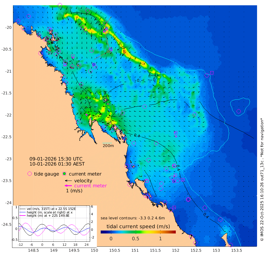 19cm/s -180T +10cm/s rms + 2cm/s 5T. Brampton I 18m 28cm/s 172T +9cm/s rms + 6cm/s 66T. Wigton I 38m 7cm/s -150T +7cm/s rms + 8cm/s 141T. Tern I 47m 29cm/s -166T +7cm/s rms + 12cm/s 54T. N Bugatti Rf 64m 34cm/s -145T +3cm/s rms + 13cm/s 178T. W Bugatti Rf 70m 13cm/s -173T +3cm/s rms + 3cm/s -130T. Creal Rf 69m 20cm/s -78T +7cm/s rms + 4cm/s 2T. North Rf 62m 24cm/s -24T +9cm/s rms + 2cm/s -56T. Cape Capricorn 26m 1cm/s -75T +5cm/s rms + 3cm/s 166T. L Musgrave I 42m 4cm/s -50T +9cm/s rms + 1cm/s -142T. Round Hill Hd 26m 2cm/s -107T +41cm/s rms + 48cm/s 116T. GBRELR 305m 17cm/s -63T +7cm/s rms + 6cm/s 123T. GBRCCH 92m 20cm/s -118T +8cm/s rms + 3cm/s -33T. GBRHIN 45m 7cm/s -98T +4cm/s rms + 2cm/s 41T. GBRHIS 46m 10cm/s -162T +16cm/s rms + 4cm/s -22T. GBROTE 59m 36cm Bell Cay -2cm Holbourne I 12cm Tern I 2cm Bugatti Rf 6cm Creal Rf 2cm White Tip I 44cm North Rf 63cm Rundle I 35cm L Musgrave I 17cm Saumarez Reef 12cm Kennedy Reef 3cm Unnamed Reef No. 2 -10cm Abbot Point -11cm Bowen -11cm Tideway Reef -2cm Hayman Island -9cm Square Reef -10cm Double Bay -25cm Molle Island -12cm Cid Harbour -2cm Hook Island -11cm Border Island -18cm Haslewood Island -10cm Shute Harbour -9cm Thomas Island -1cm Credlin Reef -17cm East Repulse Island -10cm Blacksmith Island -16cm Laguna Quays -9cm Carlisle Island (Off) -1cm St. Bees Island -8cm Scawfell Island 11cm Penrith Island 1cm Mackay Outer Harbour 8cm Hay Point 16cm Prudhoe Island 51cm Middle Island (Percy Isles) 42cm Gannet Cay 12cm Elusive Reef 17cm Mcewin Islet 57cm Mumford Island 48cm Osborn Island 51cm Marquis Island 42cm Reef Point 43cm High Peak Island 69cm Port Clinton 67cm Peaked Island 46cm Karamea Bank 68cm Johnson Patch - NW 71cm Rosslyn Bay 69cm Middle Island (Keppel Isles) 81cm Port Alma 45cm Heron Island 57cm One Tree Islet 59cm Polmaise Reef 48cm Tryon Island 49cm Rock Cod Shoal 61cm Gatcombe Head 70cm Gladstone 68cm South Trees (Storm Surge) 58cm Clews Point 48cm Round Hill Head 34cm Lady Elliot Island 36cm Breaksea Spit 53cm Bundaberg (Burnett Heads) 53cm Elliot Heads 24cm Waddy Point (Fraser Island)