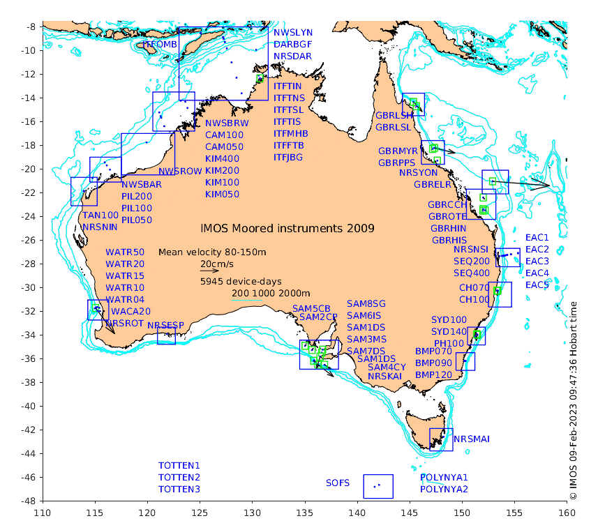 These maps show some basic analyses of the velocity data: mean and sub-tidal variance for several layers and time-windows, and tidal harmonics for the depth-average velocity using the whole record. Click through to see more detailed plots of the selected dataset or to download those data from the AODN thredds server.