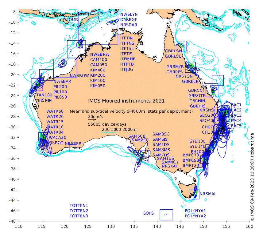 These maps show some basic analyses of the velocity data: mean and sub-tidal variance for several layers and time-windows, and tidal harmonics for the depth-average velocity using the whole record. Click through to see more detailed plots of the selected dataset or to download those data from the AODN thredds server.