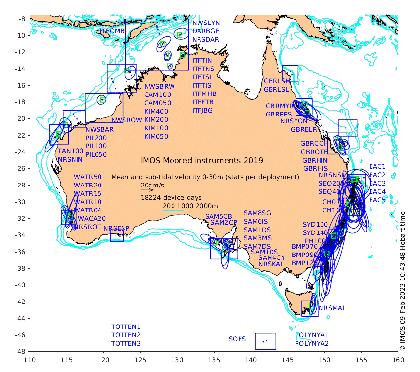 These maps show some basic analyses of the velocity data: mean and sub-tidal variance for several layers and time-windows, and tidal harmonics for the depth-average velocity using the whole record. Click through to see more detailed plots of the selected dataset or to download those data from the AODN thredds server.