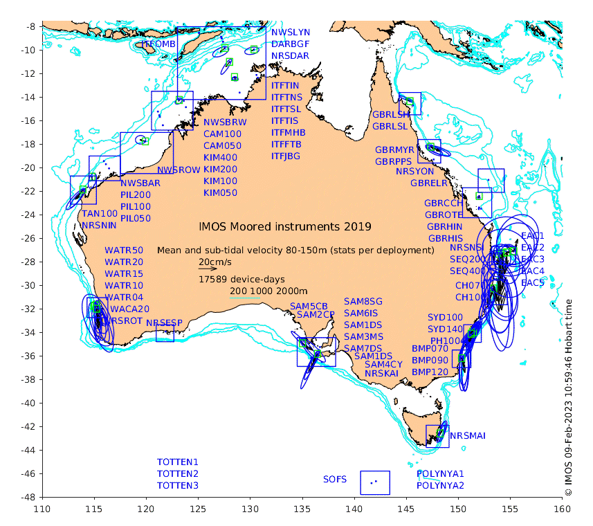 These maps show some basic analyses of the velocity data: mean and sub-tidal variance for several layers and time-windows, and tidal harmonics for the depth-average velocity using the whole record. Click through to see more detailed plots of the selected dataset or to download those data from the AODN thredds server.