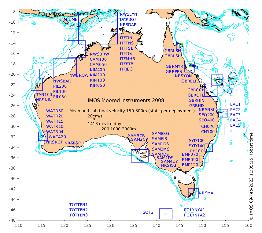 These maps show some basic analyses of the velocity data: mean and sub-tidal variance for several layers and time-windows, and tidal harmonics for the depth-average velocity using the whole record. Click through to see more detailed plots of the selected dataset or to download those data from the AODN thredds server.