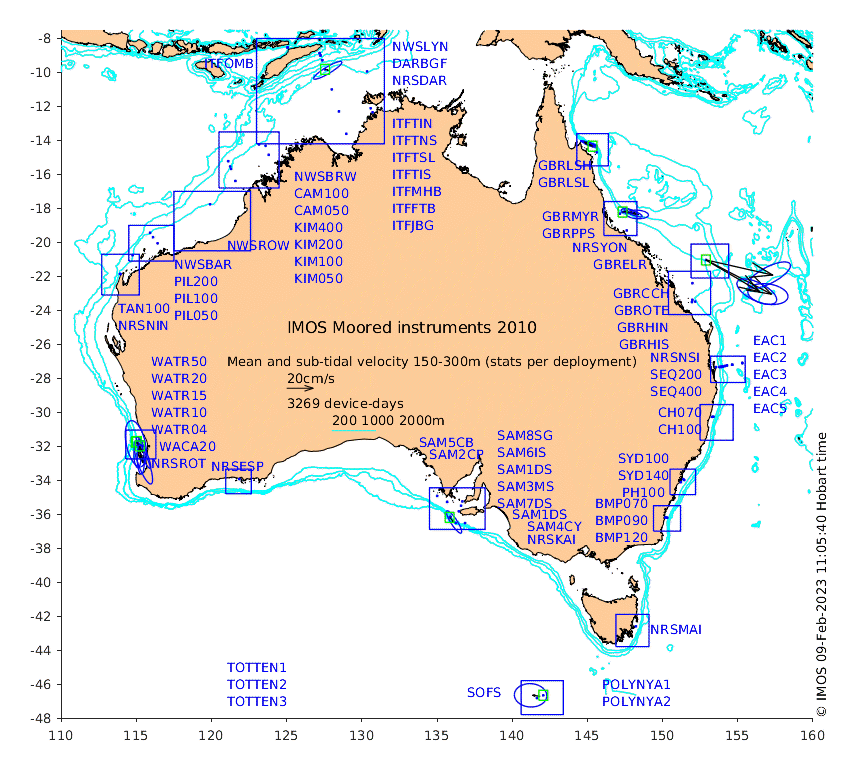 These maps show some basic analyses of the velocity data: mean and sub-tidal variance for several layers and time-windows, and tidal harmonics for the depth-average velocity using the whole record. Click through to see more detailed plots of the selected dataset or to download those data from the AODN thredds server.