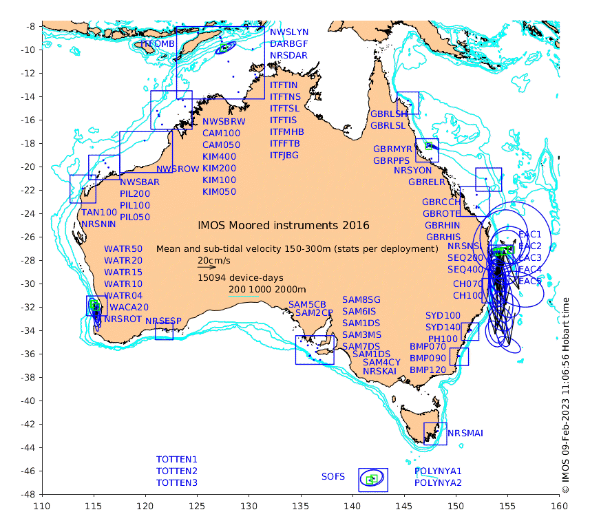 These maps show some basic analyses of the velocity data: mean and sub-tidal variance for several layers and time-windows, and tidal harmonics for the depth-average velocity using the whole record. Click through to see more detailed plots of the selected dataset or to download those data from the AODN thredds server.