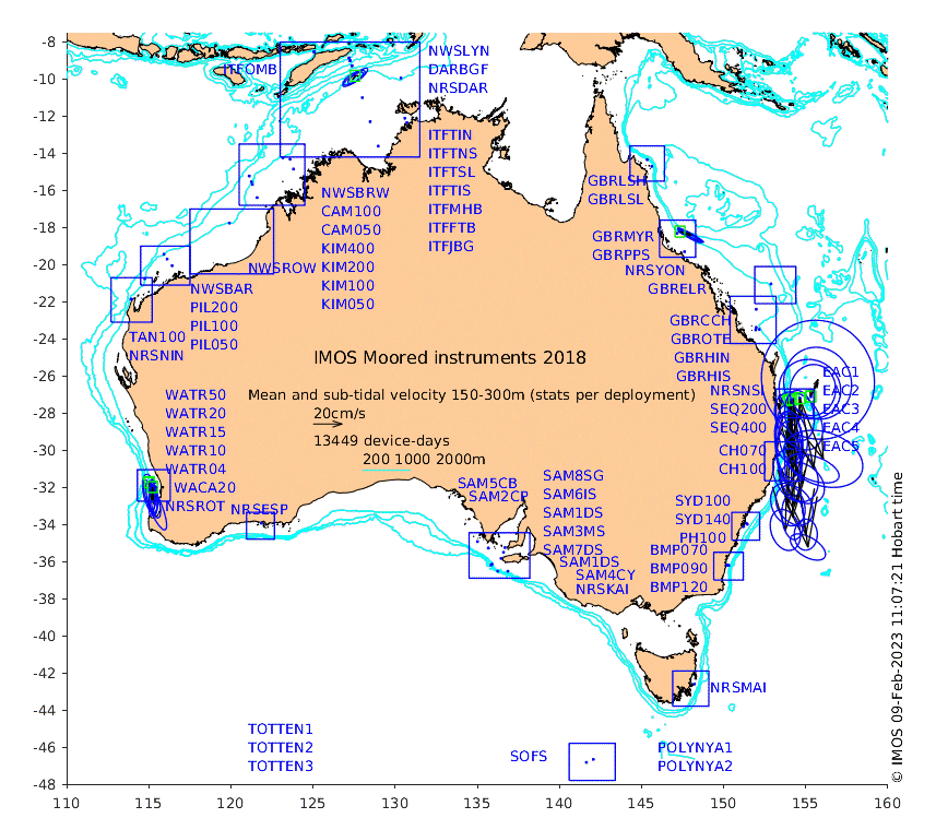 These maps show some basic analyses of the velocity data: mean and sub-tidal variance for several layers and time-windows, and tidal harmonics for the depth-average velocity using the whole record. Click through to see more detailed plots of the selected dataset or to download those data from the AODN thredds server.