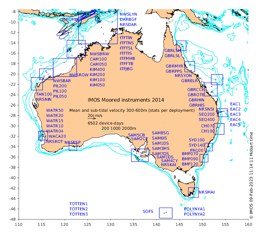 These maps show some basic analyses of the velocity data: mean and sub-tidal variance for several layers and time-windows, and tidal harmonics for the depth-average velocity using the whole record. Click through to see more detailed plots of the selected dataset or to download those data from the AODN thredds server.