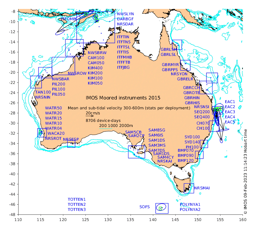 These maps show some basic analyses of the velocity data: mean and sub-tidal variance for several layers and time-windows, and tidal harmonics for the depth-average velocity using the whole record. Click through to see more detailed plots of the selected dataset or to download those data from the AODN thredds server.