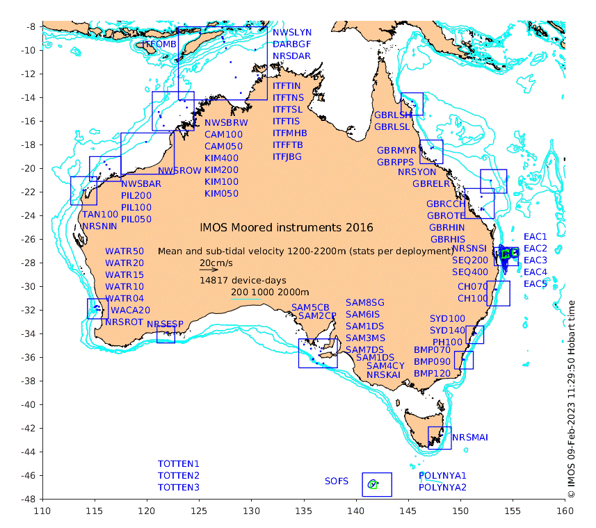These maps show some basic analyses of the velocity data: mean and sub-tidal variance for several layers and time-windows, and tidal harmonics for the depth-average velocity using the whole record. Click through to see more detailed plots of the selected dataset or to download those data from the AODN thredds server.