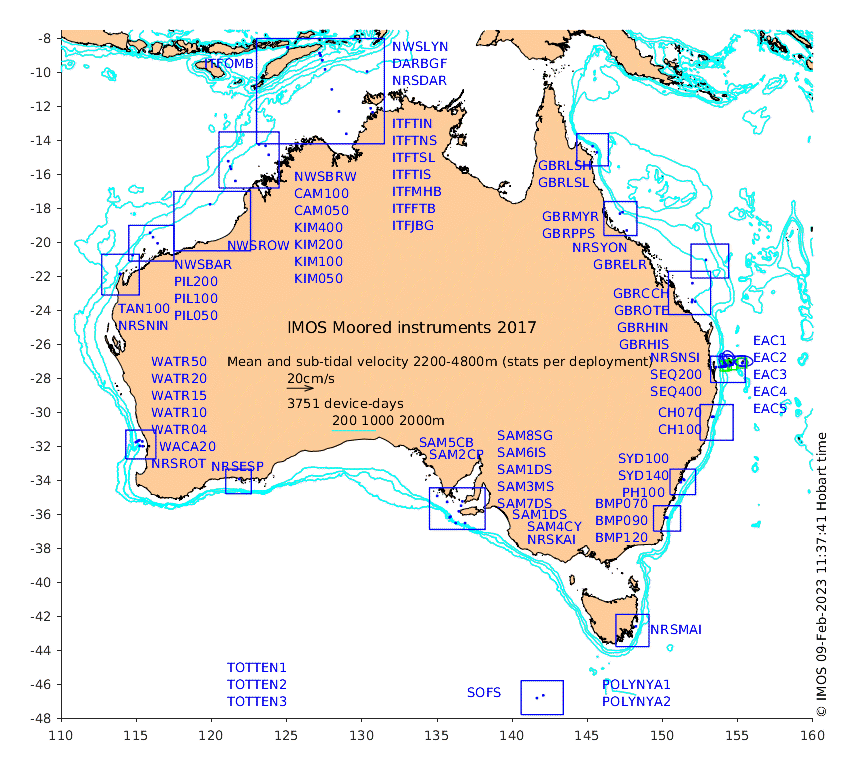 These maps show some basic analyses of the velocity data: mean and sub-tidal variance for several layers and time-windows, and tidal harmonics for the depth-average velocity using the whole record. Click through to see more detailed plots of the selected dataset or to download those data from the AODN thredds server.