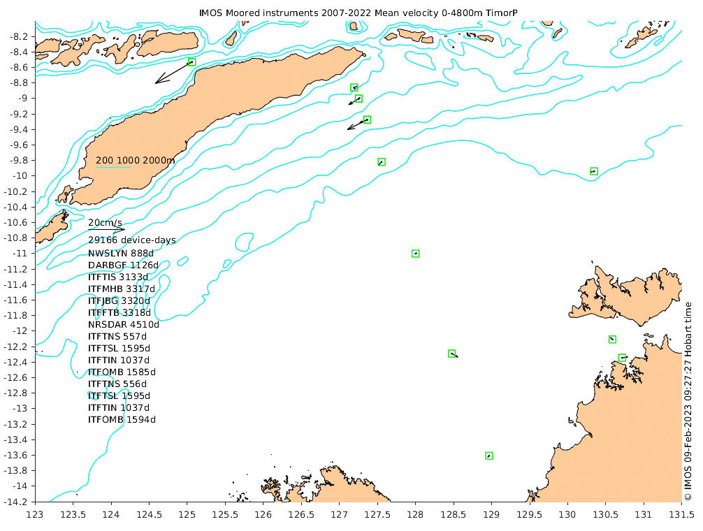 These maps show some basic analyses of the velocity data: mean and sub-tidal variance for several layers and time-windows, and tidal harmonics for the depth-average velocity using the whole record. Click through to see more detailed plots of the selected dataset or to download those data from the AODN thredds server.