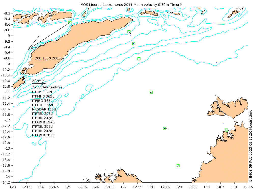 These maps show some basic analyses of the velocity data: mean and sub-tidal variance for several layers and time-windows, and tidal harmonics for the depth-average velocity using the whole record. Click through to see more detailed plots of the selected dataset or to download those data from the AODN thredds server.