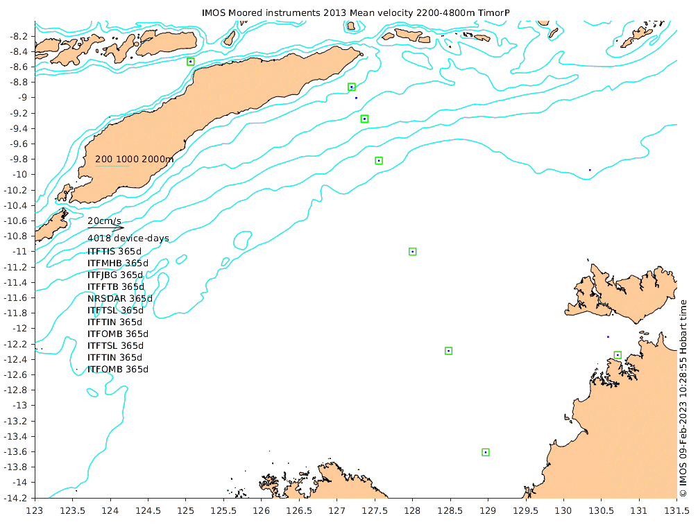 These maps show some basic analyses of the velocity data: mean and sub-tidal variance for several layers and time-windows, and tidal harmonics for the depth-average velocity using the whole record. Click through to see more detailed plots of the selected dataset or to download those data from the AODN thredds server.