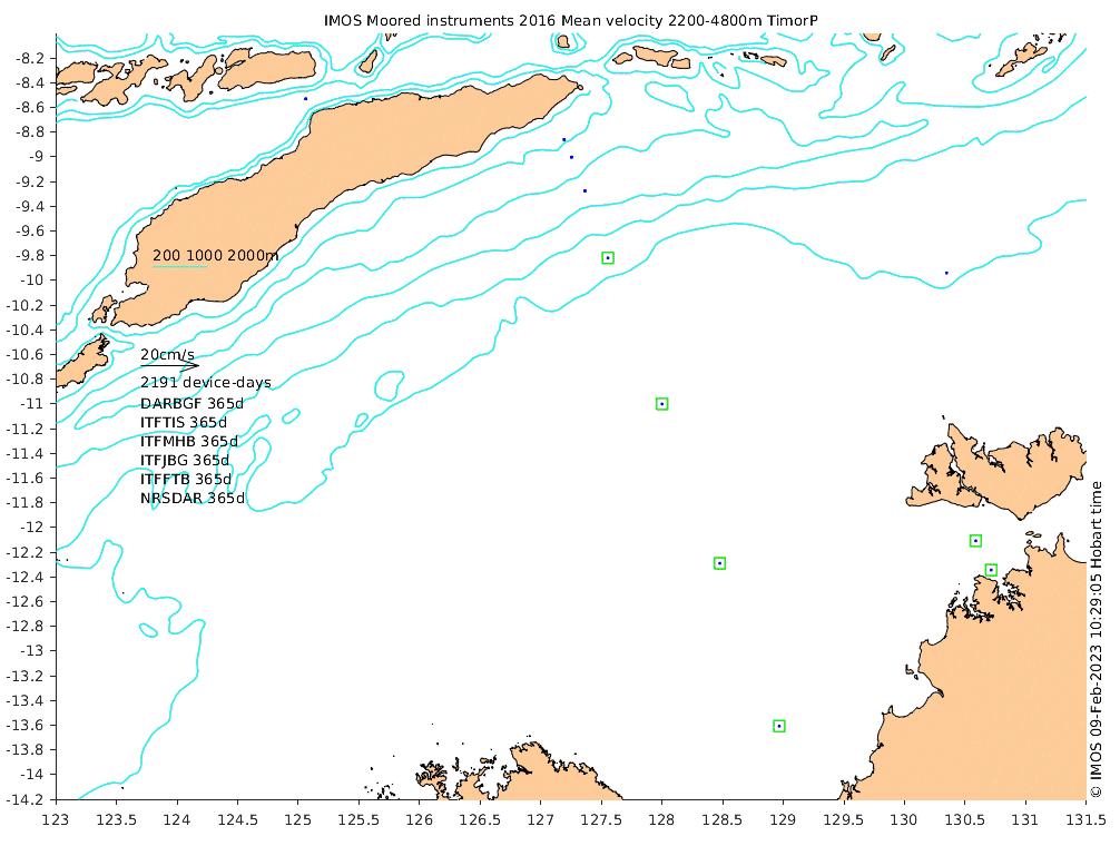 These maps show some basic analyses of the velocity data: mean and sub-tidal variance for several layers and time-windows, and tidal harmonics for the depth-average velocity using the whole record. Click through to see more detailed plots of the selected dataset or to download those data from the AODN thredds server.
