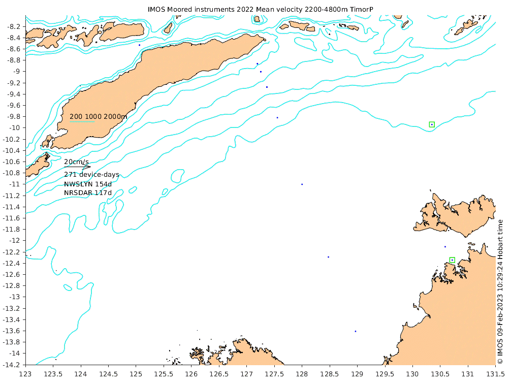 These maps show some basic analyses of the velocity data: mean and sub-tidal variance for several layers and time-windows, and tidal harmonics for the depth-average velocity using the whole record. Click through to see more detailed plots of the selected dataset or to download those data from the AODN thredds server.