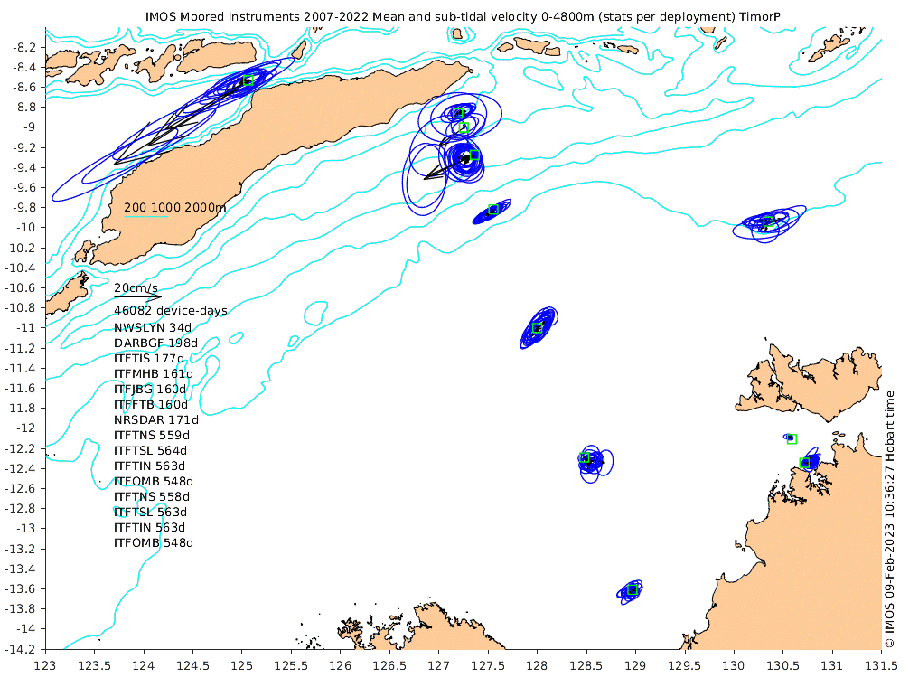 These maps show some basic analyses of the velocity data: mean and sub-tidal variance for several layers and time-windows, and tidal harmonics for the depth-average velocity using the whole record. Click through to see more detailed plots of the selected dataset or to download those data from the AODN thredds server.