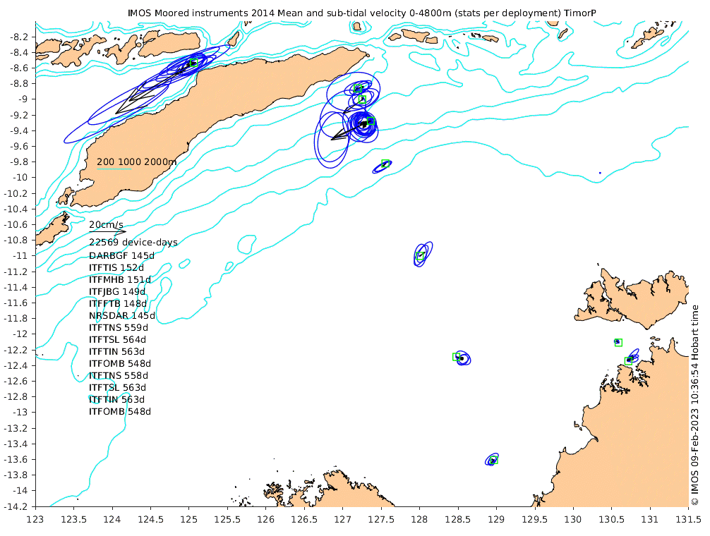 These maps show some basic analyses of the velocity data: mean and sub-tidal variance for several layers and time-windows, and tidal harmonics for the depth-average velocity using the whole record. Click through to see more detailed plots of the selected dataset or to download those data from the AODN thredds server.