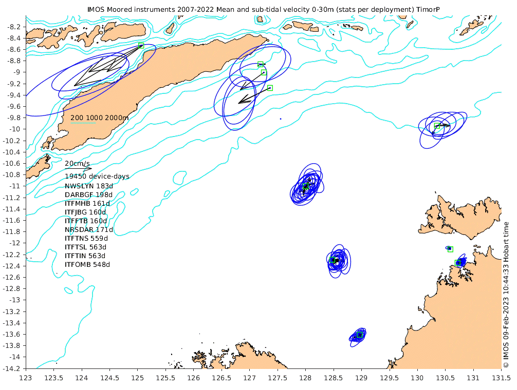 These maps show some basic analyses of the velocity data: mean and sub-tidal variance for several layers and time-windows, and tidal harmonics for the depth-average velocity using the whole record. Click through to see more detailed plots of the selected dataset or to download those data from the AODN thredds server.