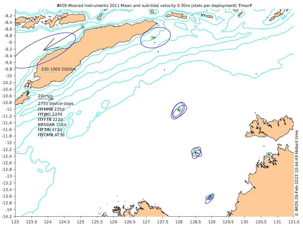 These maps show some basic analyses of the velocity data: mean and sub-tidal variance for several layers and time-windows, and tidal harmonics for the depth-average velocity using the whole record. Click through to see more detailed plots of the selected dataset or to download those data from the AODN thredds server.
